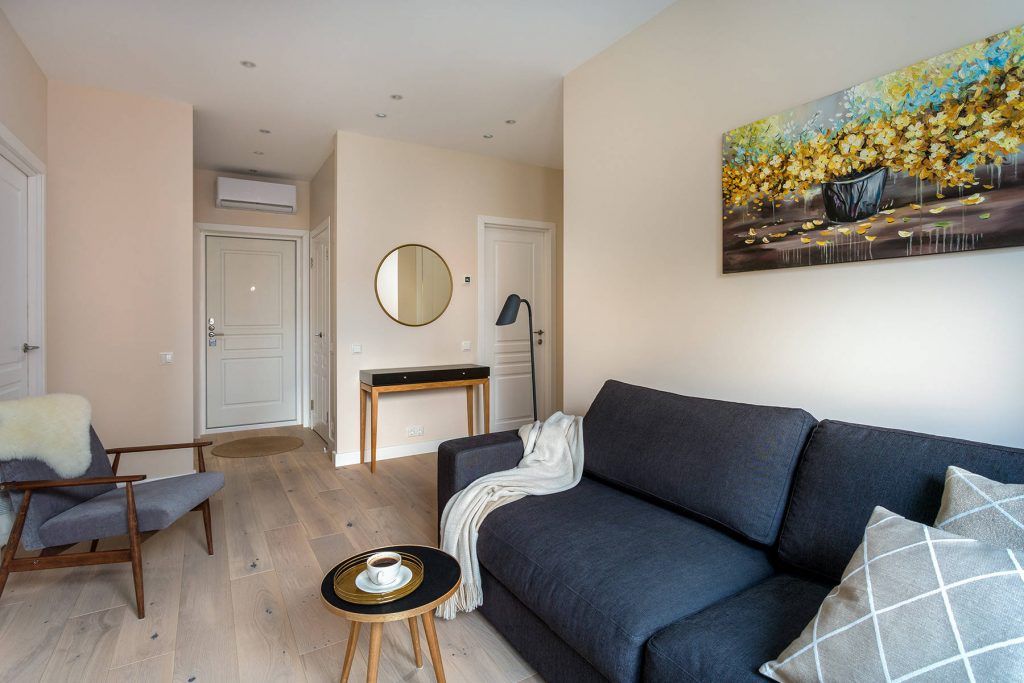 Pentru zona de zi, livingul a fost conturat intr-o maniera minimalista, cu canapea, doua corpuri de mobilier si un fotoliu. Desi redus ca suprafata, spatiul ramane aerisit si fluent. Cu ajutorul culorilor, texturilor si accesoriilor incaperea primeste personalitate discreta.