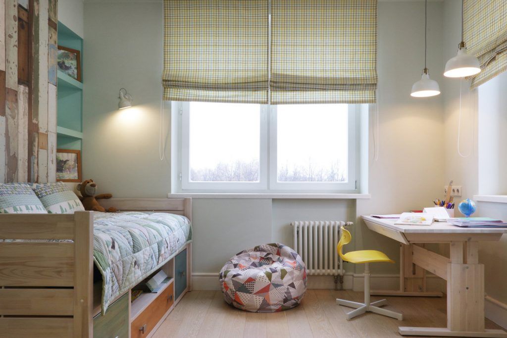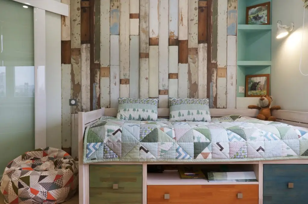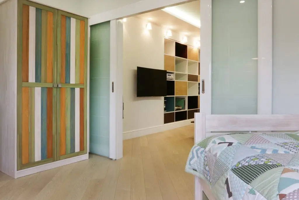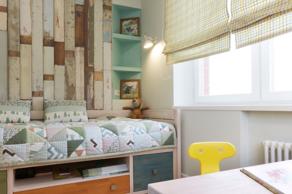 Camera copilului, cu acces direct din living prin 2 usi glisante, este amenajata cu bun-gust. Ne place jocul placarilor variate atat pe perete cat si pe dulapul cu haine, dar si pe cuvertura patchwork de pe pat. Decorul este vesel cu nuante deschise care amplifica spatiul si ii sporesc luminozitatea.