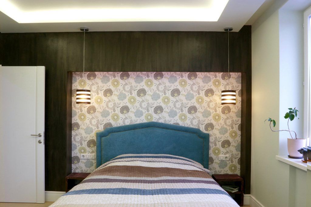 Si pentru dormitorul matrimonial s-a mers pe ideea functionalitatii, dar cu stil. O zona de accent cu un tapet cu imprimeu floral, tablie de pat tapitata si 2 corpuri de iluminat suspendate de o parte si cealalta a patului. Suprafata nu este una generoasa, de aceea adaptarea prin alegerea unor noptiere mici care ocupa putin spatiu in ansamblul camerei.