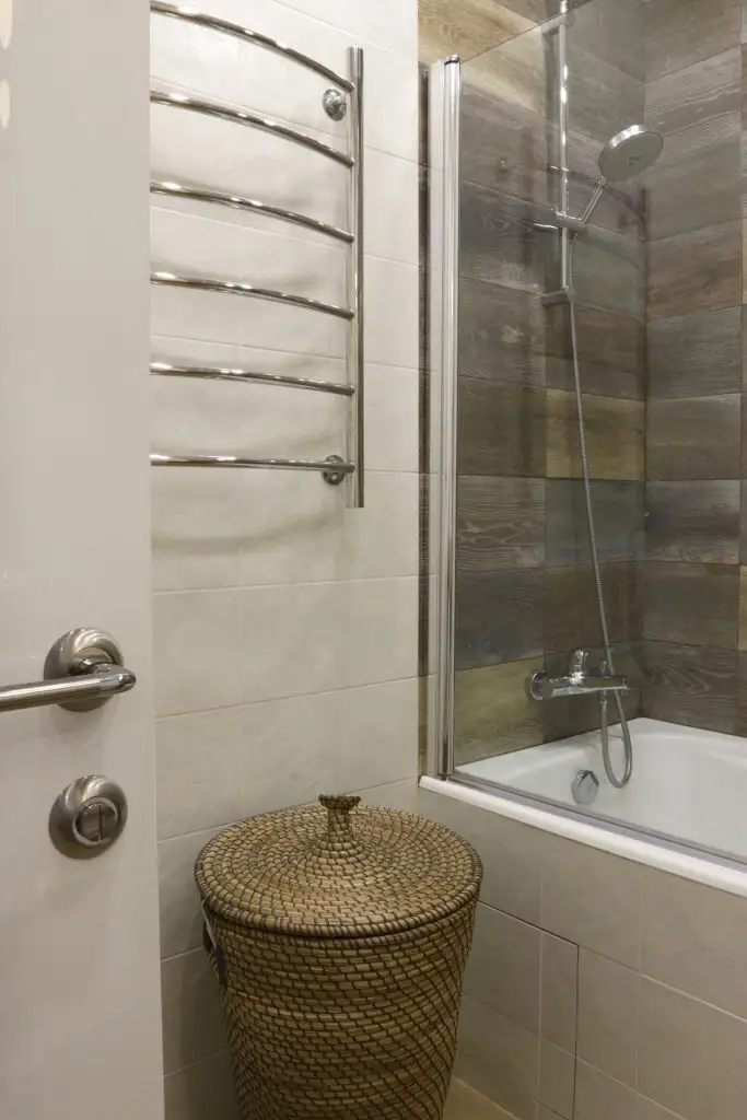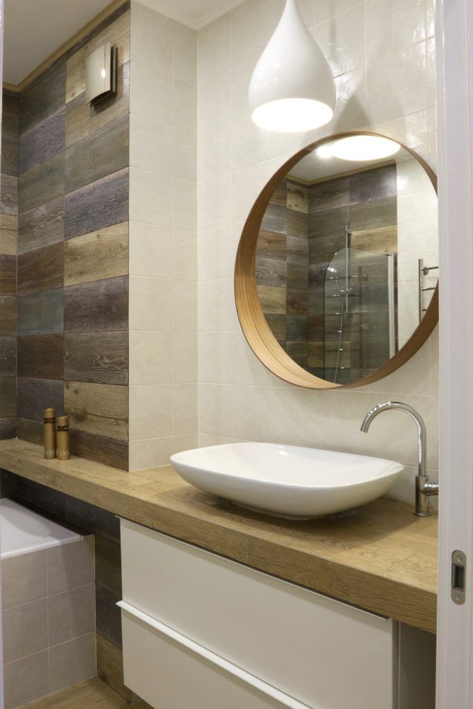 Inspiratie vei gasi si in amenajarea baii. Placile ceramice care imita lemnul contureaza o zona de accent in jurul cazii, iar blatul pe care se afla lavoarul urmeaza linia peretelui pe lungimea sa, oferind mai mult spatiu de depozitare.