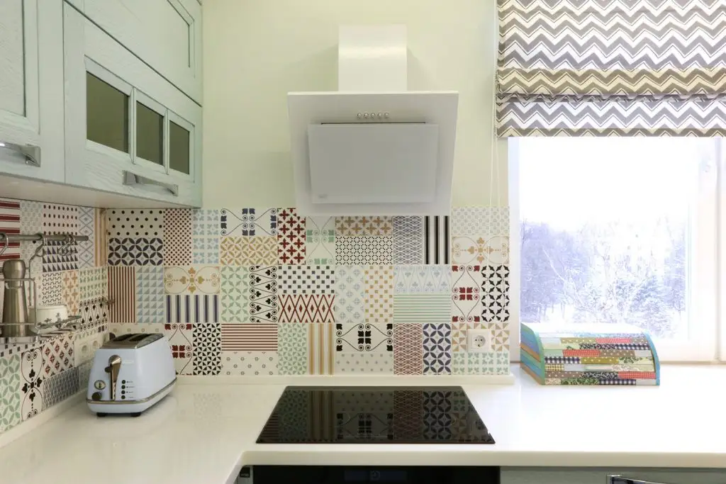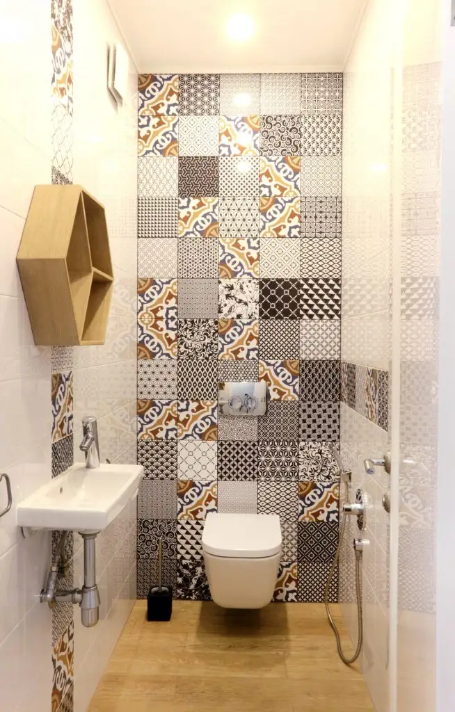 De cealalta parte, jocul rafturilor ce formeaza biblioteca ne atrage si ea atentia. Acelasi motiv al patchwork-ului il regasim si in bucatarie la nivelul placilor ceramice sau in camera copilului prin peretele placat, usile dulapului sau cuvertura de pat. Nici baia nu face abstractie placi patchwork vom regasi si aici.