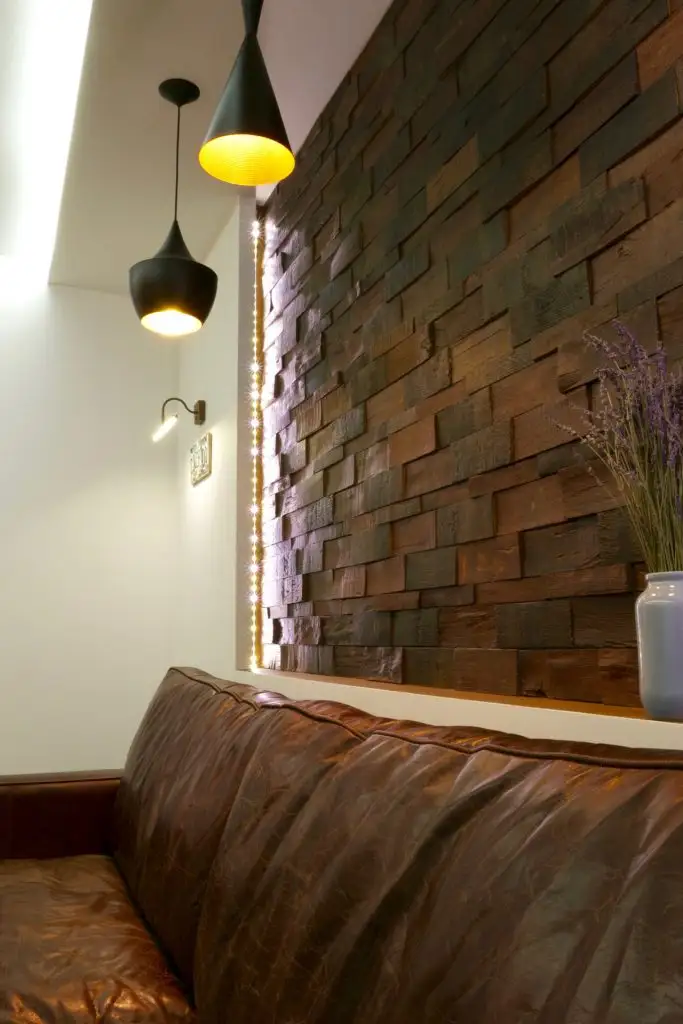 Predomina nuante neutre, cu alb si esente de lemn, si accente de culori si texturi care personalizeaza spatiul intr-un mod original. In acest sens, in living ne place peretele-accent cu un panou tridimensional realizat din lemn invechit de stejar si canapeaua din piele in ton cu ceea ce regasim pe perete. Tot acest cadru este iluminat cu lampi Tom Dixon.