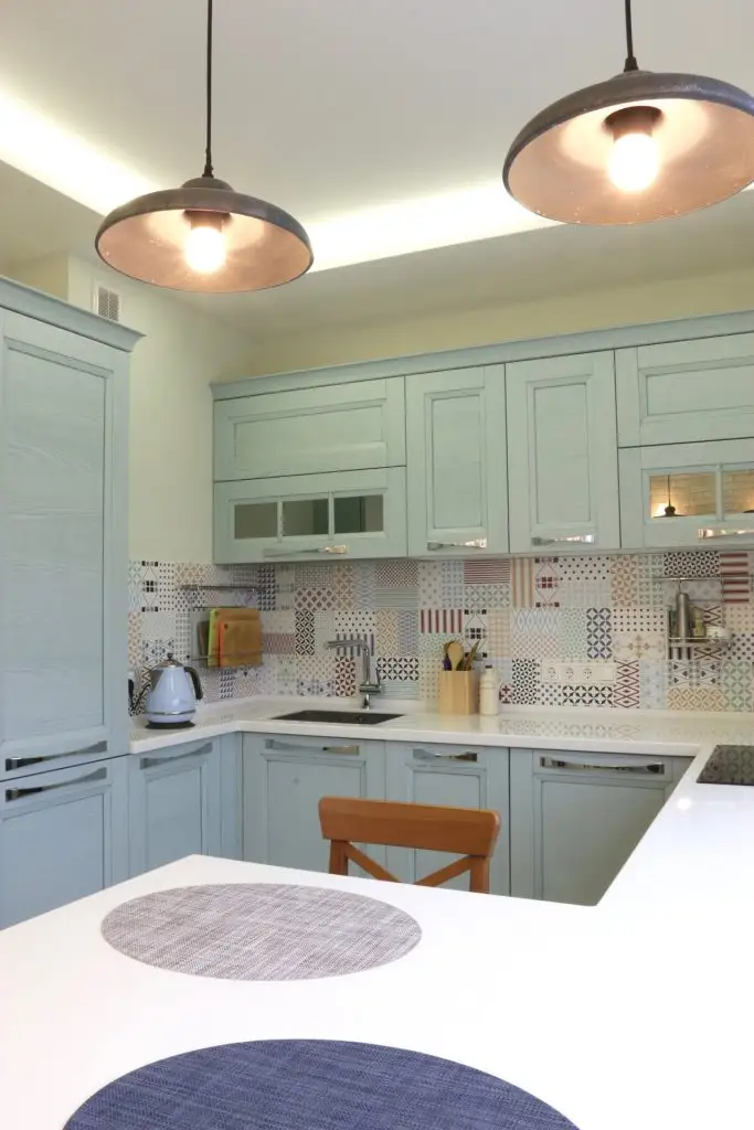 Bucataria este amenajata in mod practic si functional. Electrocasnice incorporate, spatiu pe blatul de lucru ce se continua sub forma unui loc de luat masa, ingenios integrat. Nuantele deschise si motivul jucaus al placilor ceramice contureaza o bucatarie vesela, dinamica.