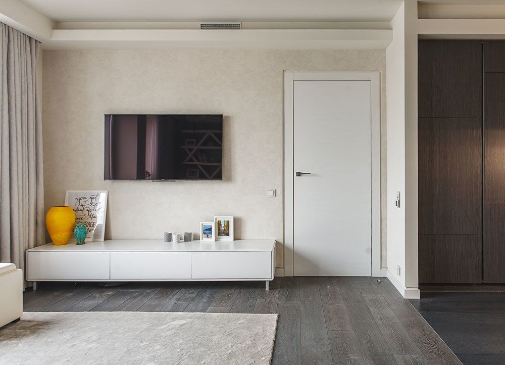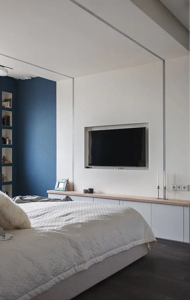 Peretele cu televizorul este alb in contrast cu turcoazul folosit pe peretele cu canapeaua