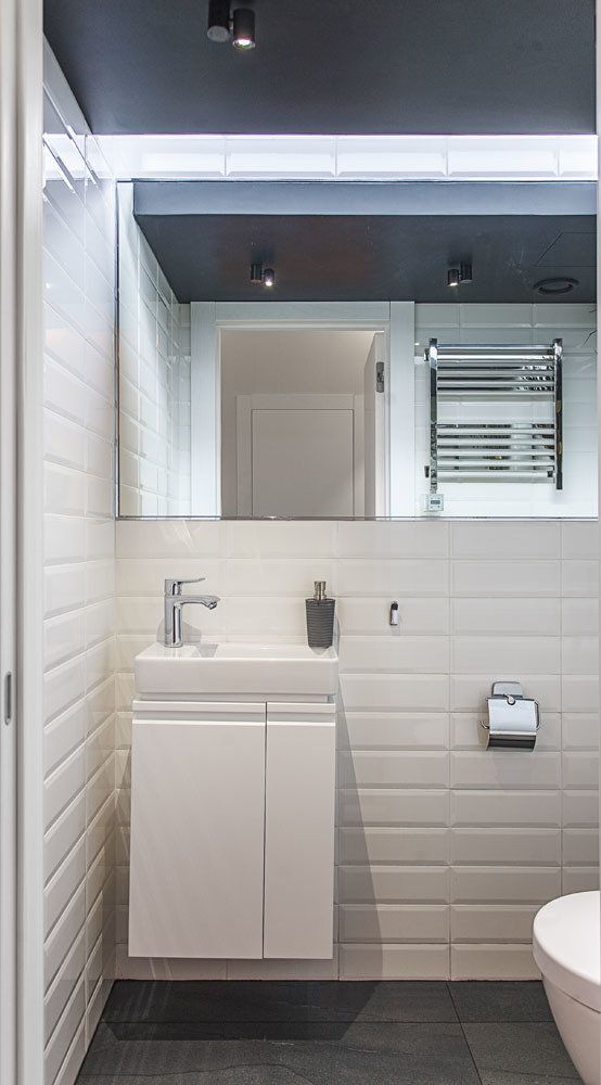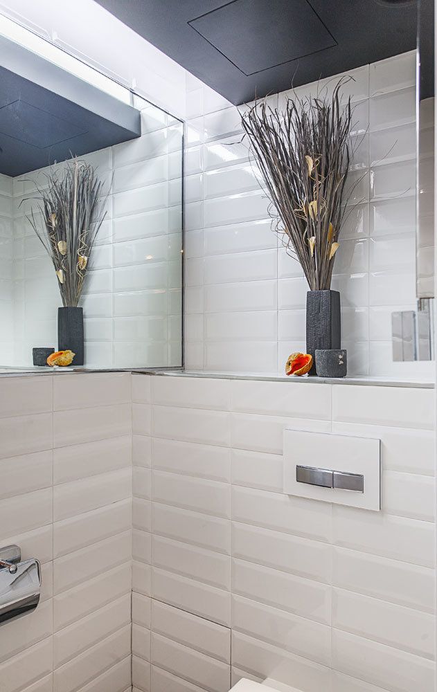 Cea de-a doua baie amenajata cu tavan negru si placi ceramice albe (tip Metro)