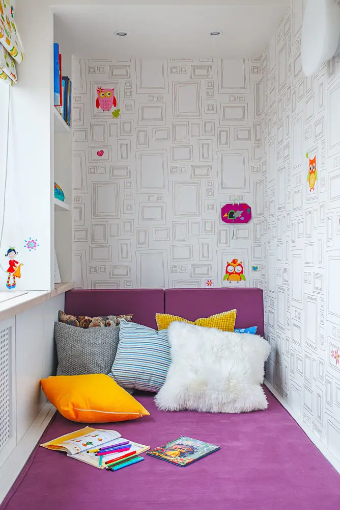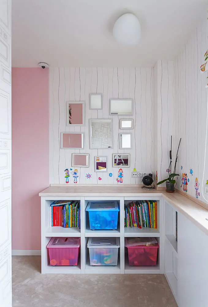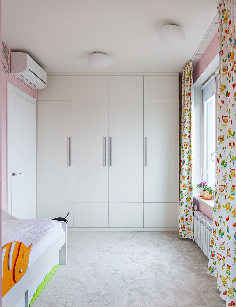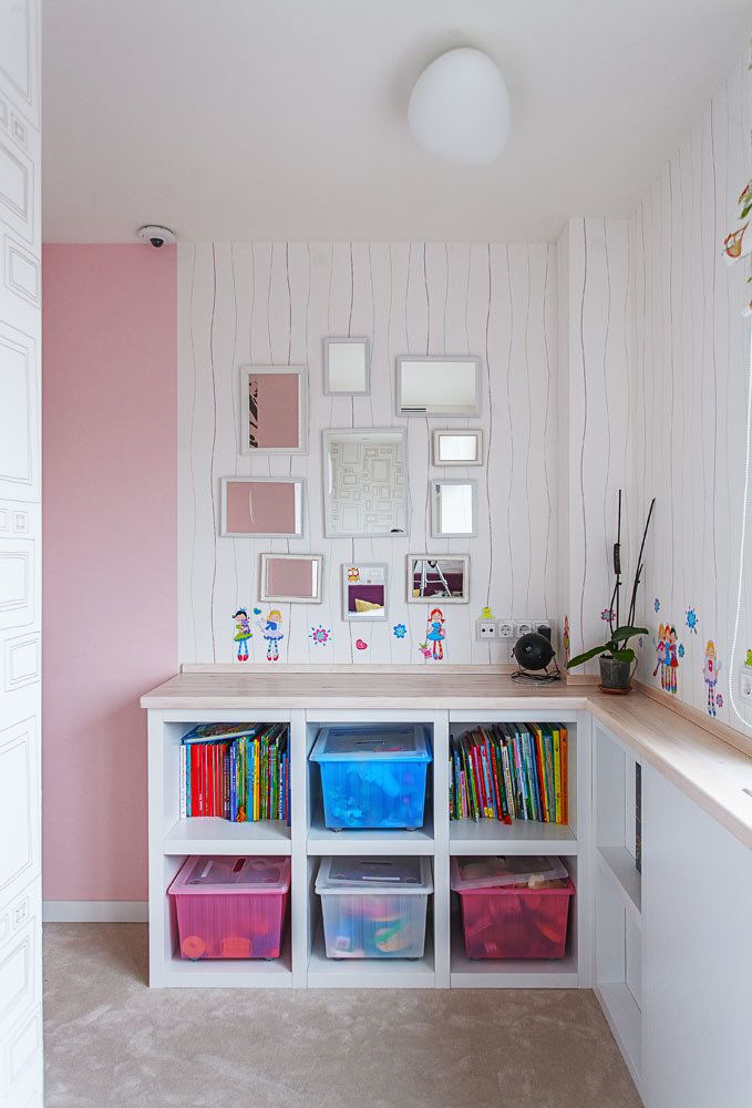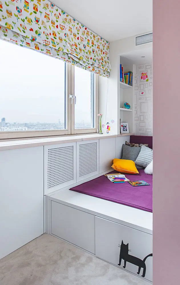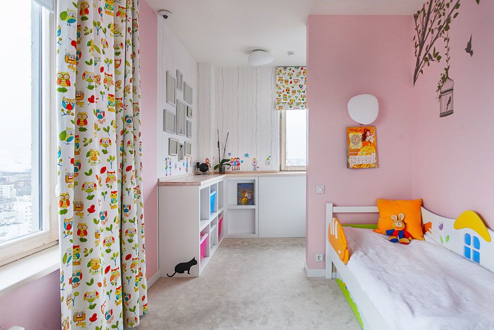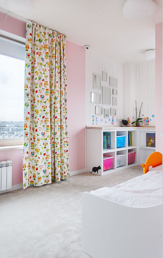 Camera fetitei ne introduce intr-un taram al jocului si povestilor. Accente de roz, perdele vesel colorate si variate spatii pentru depozitare de haine si jucarii. Interesant este locul de joaca amenajat la fereastra sub forma unei platforme. Majoritatea pieselor de mobilier au fost realizate pe comanda, dupa designul creat de arhitecta.
