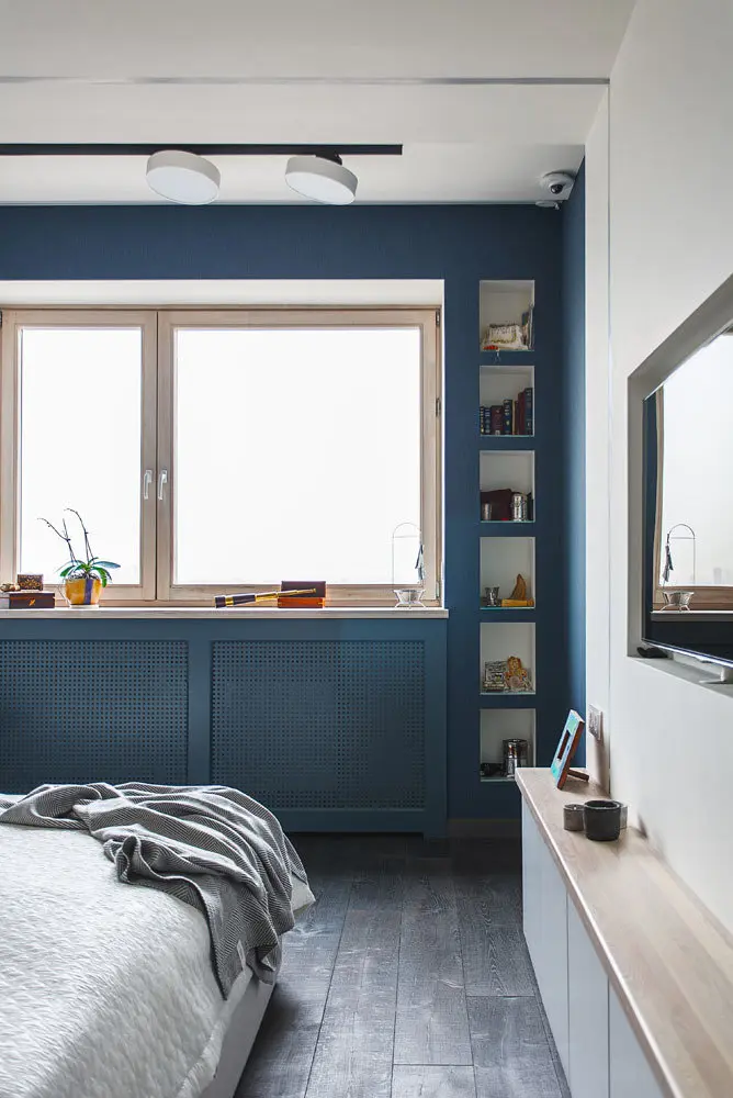 Zona-accent creata cu vopsea albastra in jurul ferestrelor (caloriferele sunt mascate)
