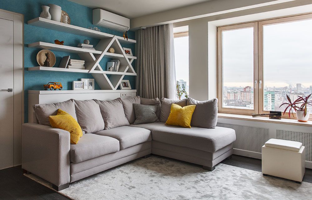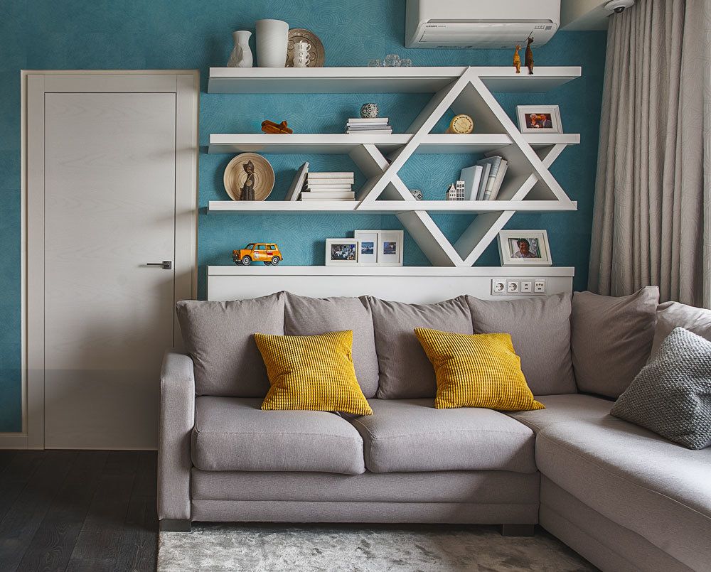 Living cu perete-accent realizat cu tapet turcoaz si etajere albe