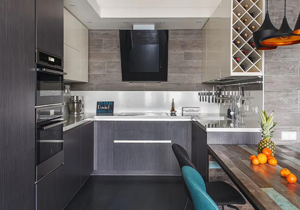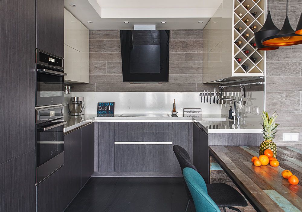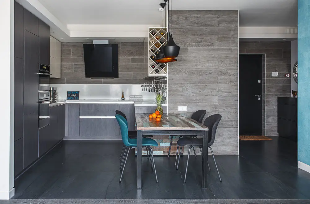 Pentru zona de gatit, Mila o optat pentru nuante inchise, ce confera profunzime si o eleganta discreta intregii amenajari. Spatiul este unitar prin mobilier compact, cu electrocasnice incorporate si fronturi mate. Acelasi tip de placare cu laminat de pe peretele cu locul de luat masa il regasim si in hol.