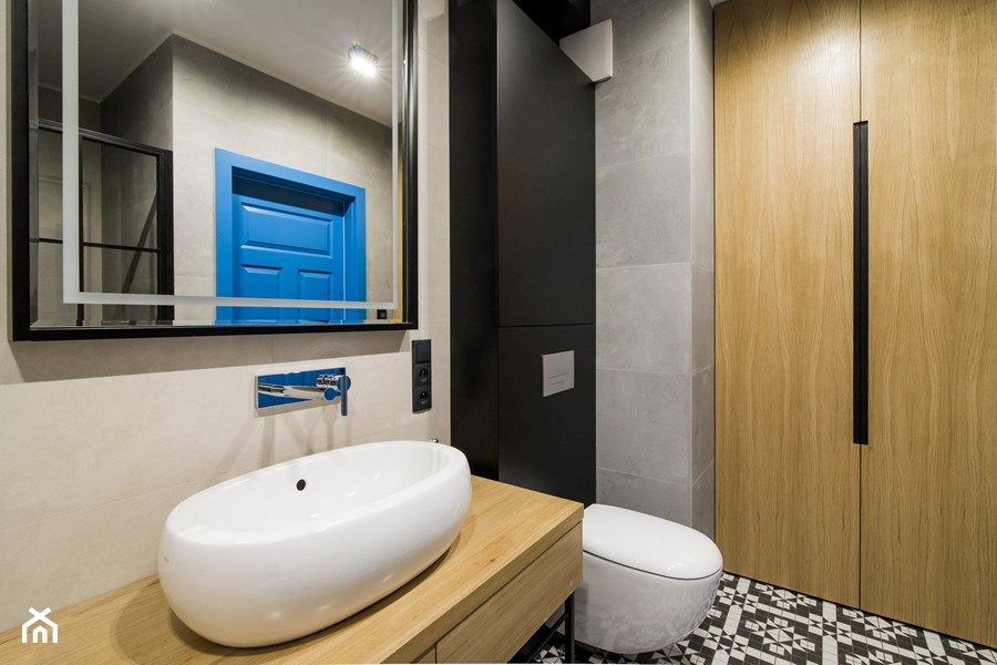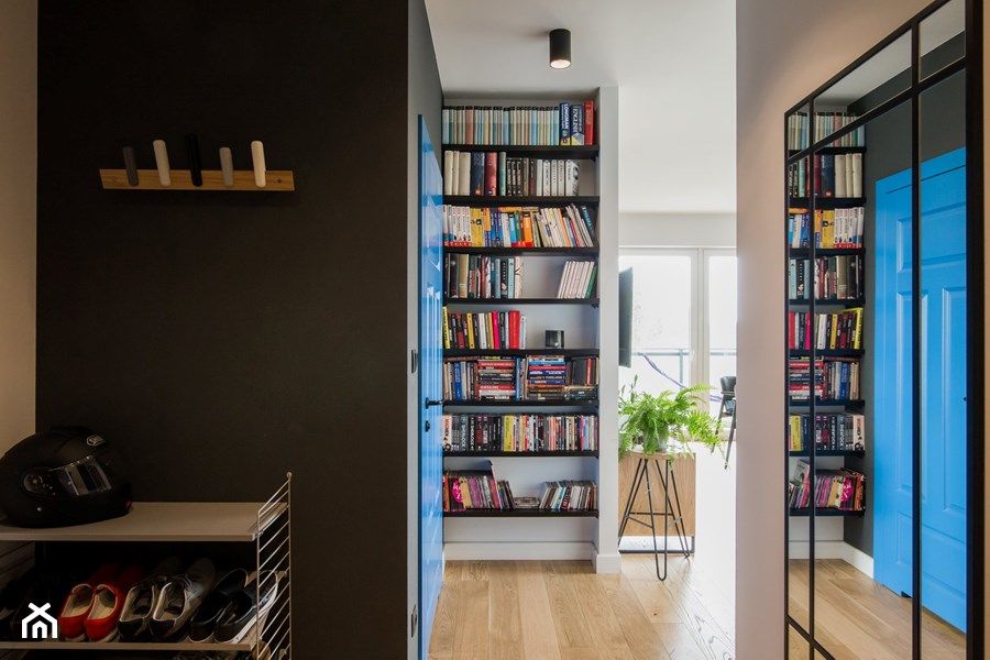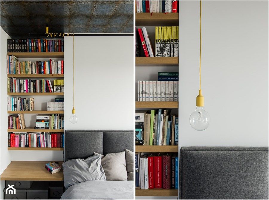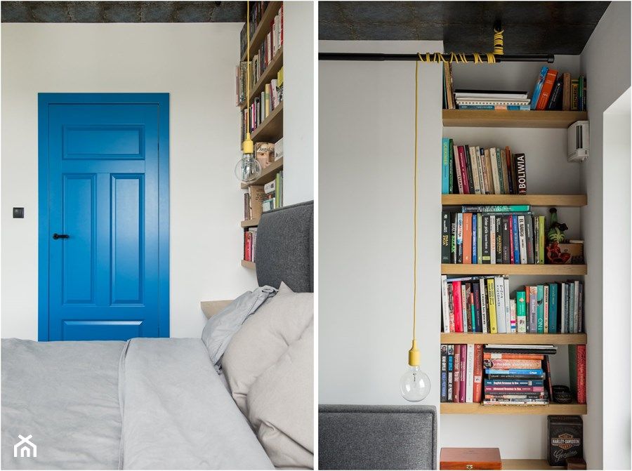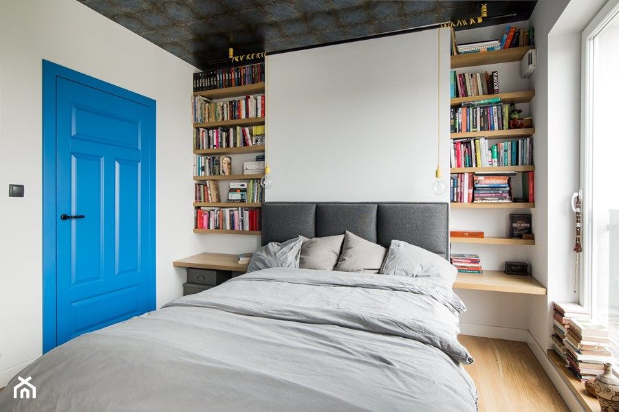 Un spatiu confortabil a fost gandit si pentru dormitor. Aici, corpurile de biblioteca dispuse simetric in jurul patuluui atrage atentia, fiind un element de accent alaturi de usa albastra. Nuantele sunt mai blande si mai deschise decat in living. Predomina un ambient seren, odihnitor, confortabil prin imbinarile de texturi. Si spatiul din bai surprinde printr-o optimizare excelenta, alaturi de un design contemporan excelent realizat.