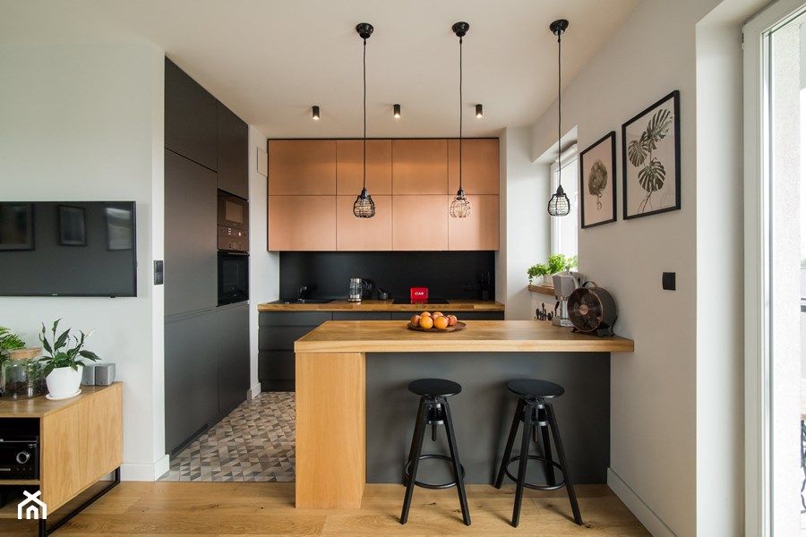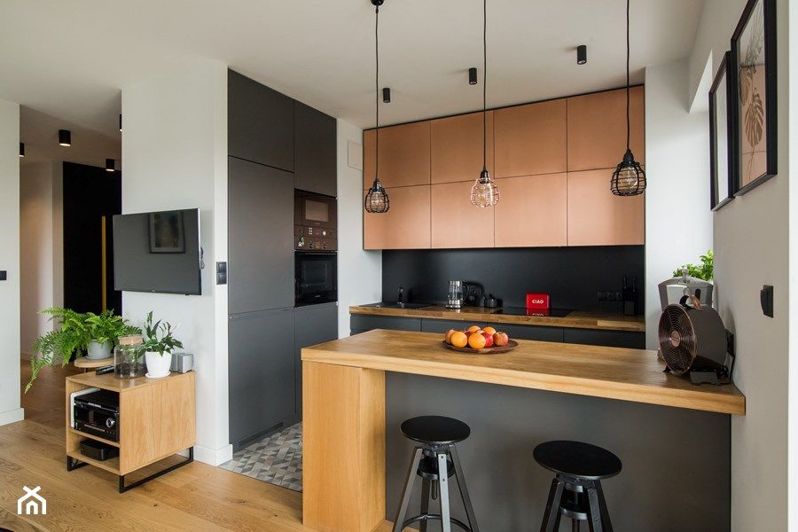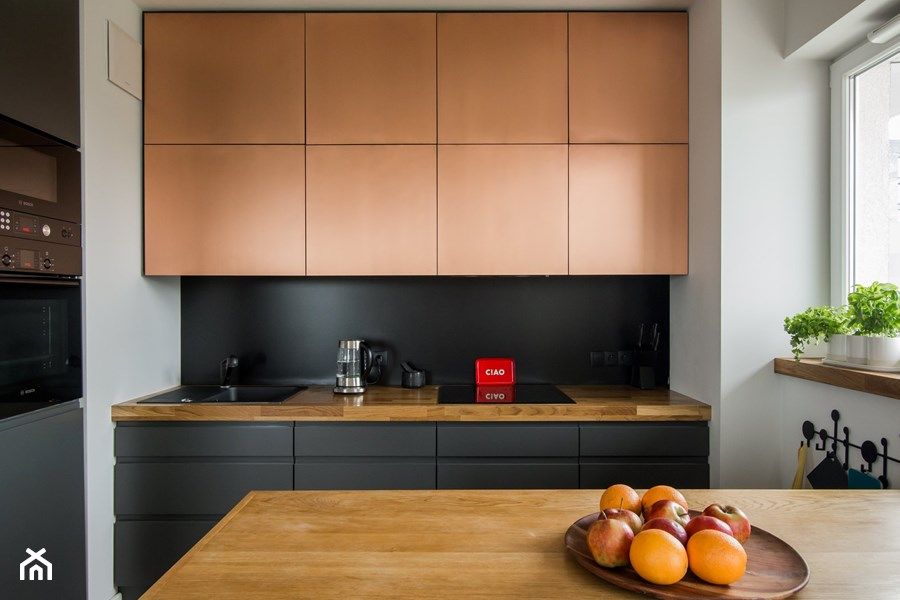 In spatiul bucatariei predomina tonuri de gri si negru, pe un fundal de alb imbinat armonios cu lemn. Bucataria este minimal redata, cu o abordare compacta. Spatiile de depozitare sunt integrate in corpurile principale, iar electrocasnicele sunt incorporate in lateral pentru mai multa unitate si ordine in decor; un corp tip insula ofera un plus de spatiu, putand fi utilizata si ca o zona de luat gustari rapide sau chiar bar.