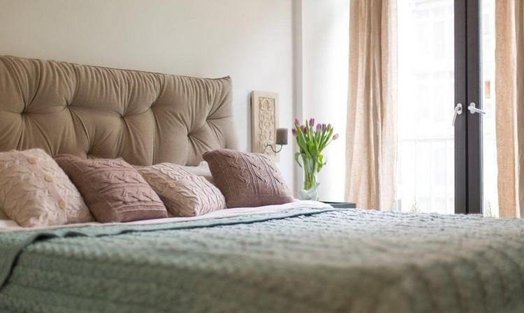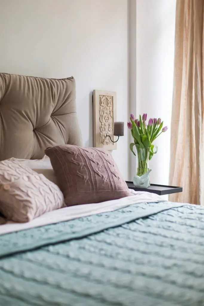 Pentru dormitor, cuvantul de baza este confortul. Texturile contribuie din plin la crearea acestui ambient relaxant prin tablie tapitata, perne decorative si cuvertura moale. Si aici patrunde multa lumina naturala, iar piesele din lemn brut aduc un plus de stil incaperii.