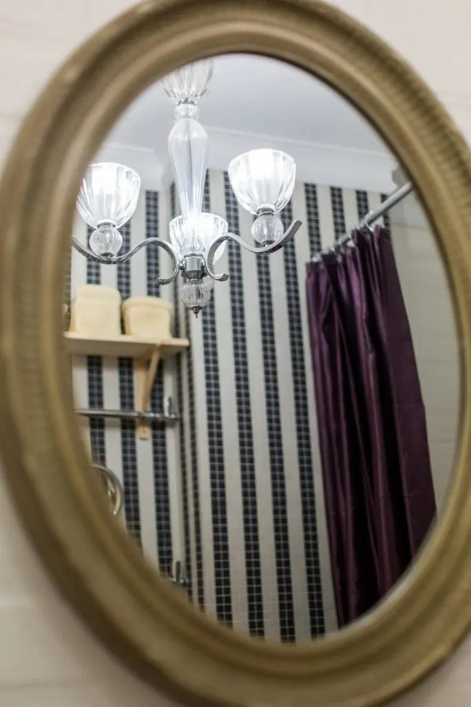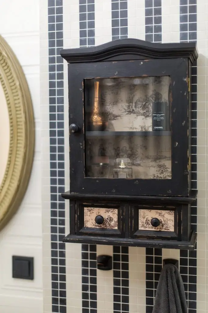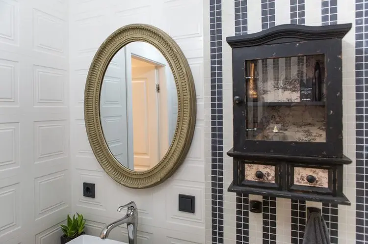 Dar, baia este cu adevarat impresionanta prin alaturarea de piese vintage, cu patina, cu finisaje speciale si lustra pe masura decorului creat.