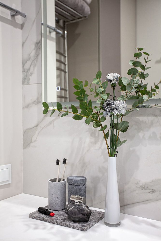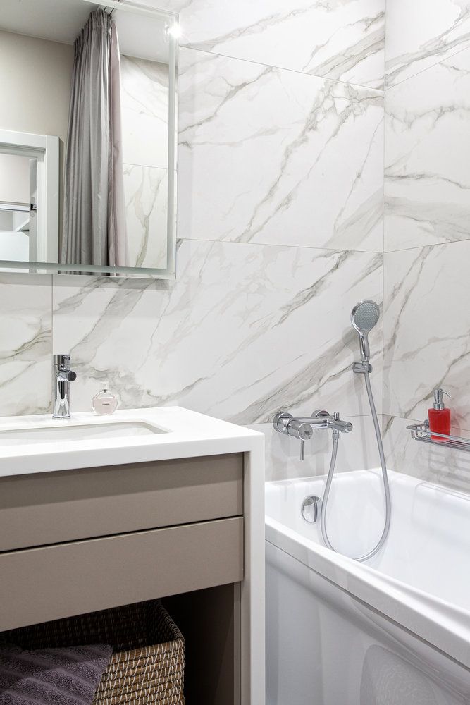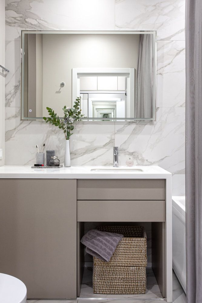 Baia a fost amenajata respectand linia stilistica a locuintei, fiind dominata de nuante neutre si de placile de marmura in format mare. Depozitarea generoasa a fost proiectata ca o carcasa continua cu lavoar incorporat si sertare cu spatii de depozitare sub blat . Usile glisante ascund si masina de spalat rufe. Oglinda iluminata cu banda led completeaza in mod reusit compozitia stilistica, fiind extrem de practica in acelasi timp.
