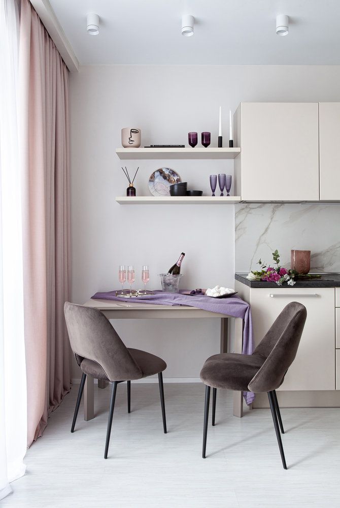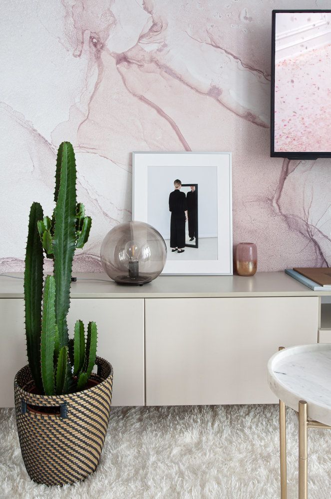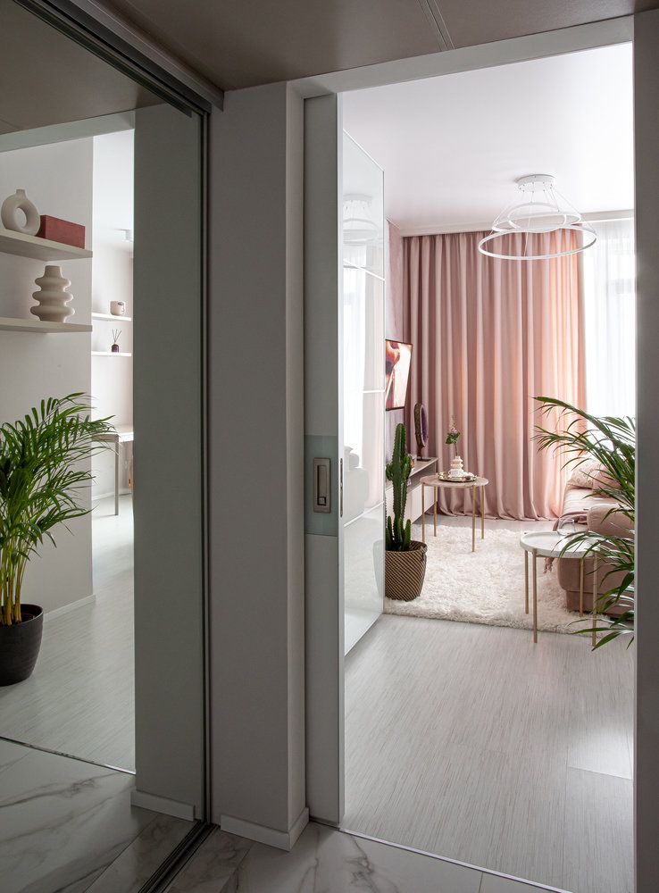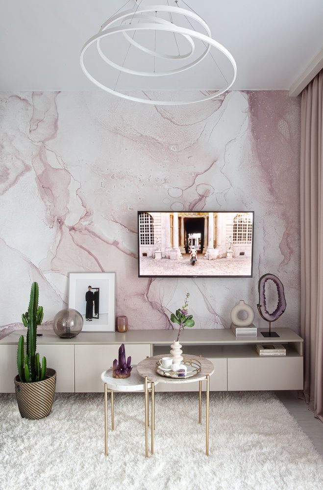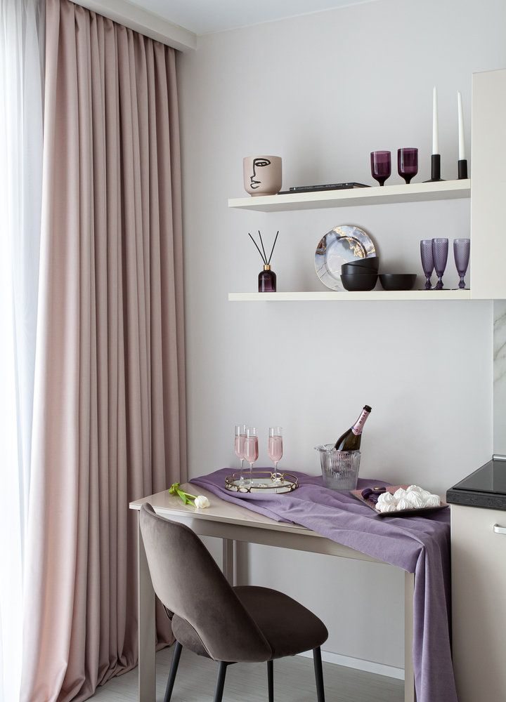 Regasim un model placut de catifea la mobilierul tapitat, covorul pufos din fata canapelei , draperiile de tip blackout din material textil intr-o nuanta calda de roz prafuit. Toate acestea contribuie cu succes la conturarea unei atmosfere calduroase si confortabile.