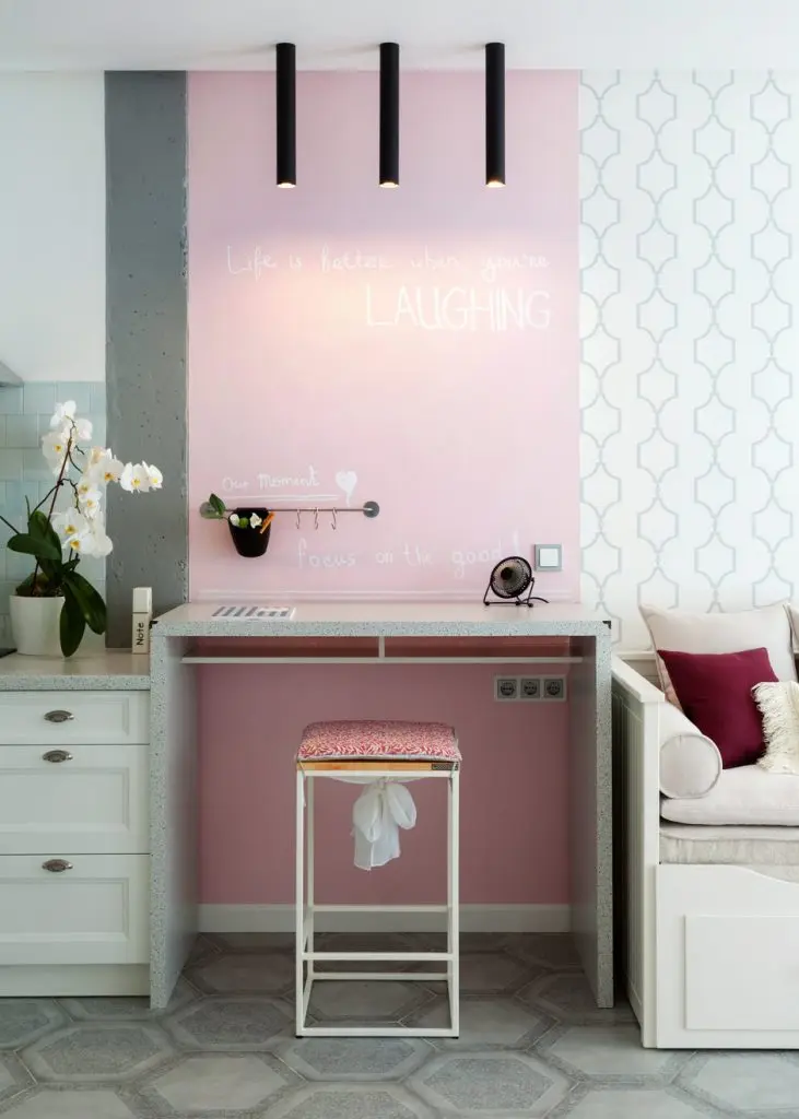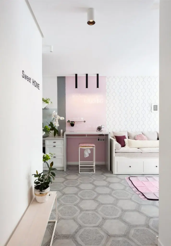 Initial s-a dorit ca toti peretii sa fie zugraviti in alb, insa acest lucru ar fi fost destul de monoton in contextul acestei amenajarii. Astfel, Irina a mizat pe o abordare moderna, poate usor neconventionala, aceea de a introduce diferite texturi si materiale care sa rupa din ritmul impus de prea mult alb: beton nefinisat, tapet si vopsea roz. Oricat de ciudat ar suna alaturarea acestor finisaje, efectul per ansamblu este surprinzator. Accesoriile si decoratiunile sunt astfel alese incat sa nu incarce inutil decorul, ba din contra sa sprijine fluiditatea si circulatiile firesti.