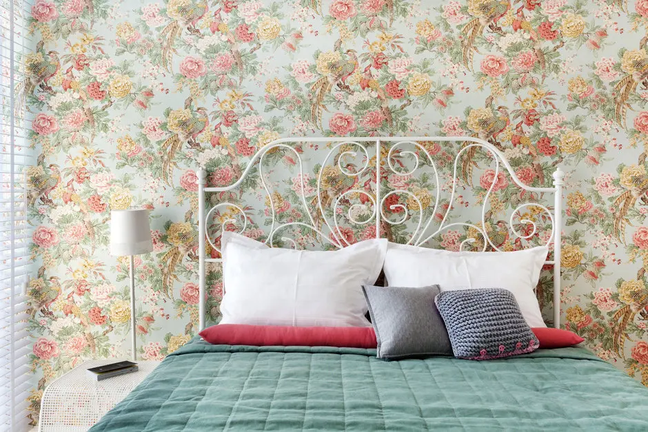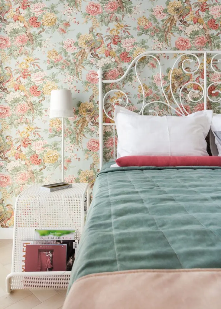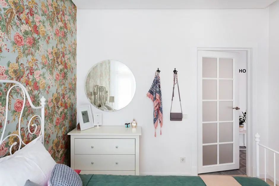 In dormitor, tapetul cu imprimeu floral te ia prin surprindere. Modelul atrage toata atentia si transforma atmosfera camerei. Restul decorului este bland, neutru, echilibrand impactul cromatic setat de zona de accent din jurul patului. Dormitorul este mic, dar foarte luminos, iar mobilierul sa rezuma la pat, comoda si o noptiera metalica alba, cu suport pentru reviste sau carti.