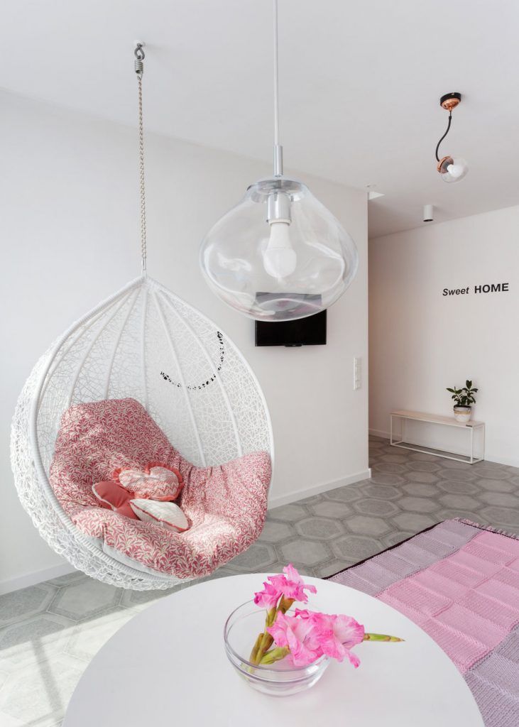Initial s-a dorit ca toti peretii sa fie zugraviti in alb, insa acest lucru ar fi fost destul de monoton in contextul acestei amenajarii. Astfel, Irina a mizat pe o abordare moderna, poate usor neconventionala, aceea de a introduce diferite texturi si materiale care sa rupa din ritmul impus de prea mult alb: beton nefinisat, tapet si vopsea roz. Oricat de ciudat ar suna alaturarea acestor finisaje, efectul per ansamblu este surprinzator. Accesoriile si decoratiunile sunt astfel alese incat sa nu incarce inutil decorul, ba din contra sa sprijine fluiditatea si circulatiile firesti.
