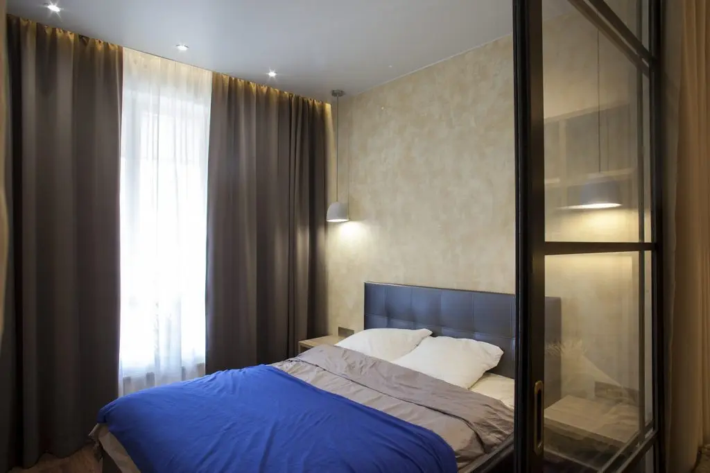 Din fericire, dimensiunile camerei au permis o astfel de amenajare, ba chiar si o sofa asezata in zona biroului. Designerul a ales sa puna in evidenta patul cu un tapet discret atat prin imprimeu, cat si culoare. Cromatic, predomina tonuri cuminti, subtil reluate la nivelul covorului, tabliei de pat si draperiilor.