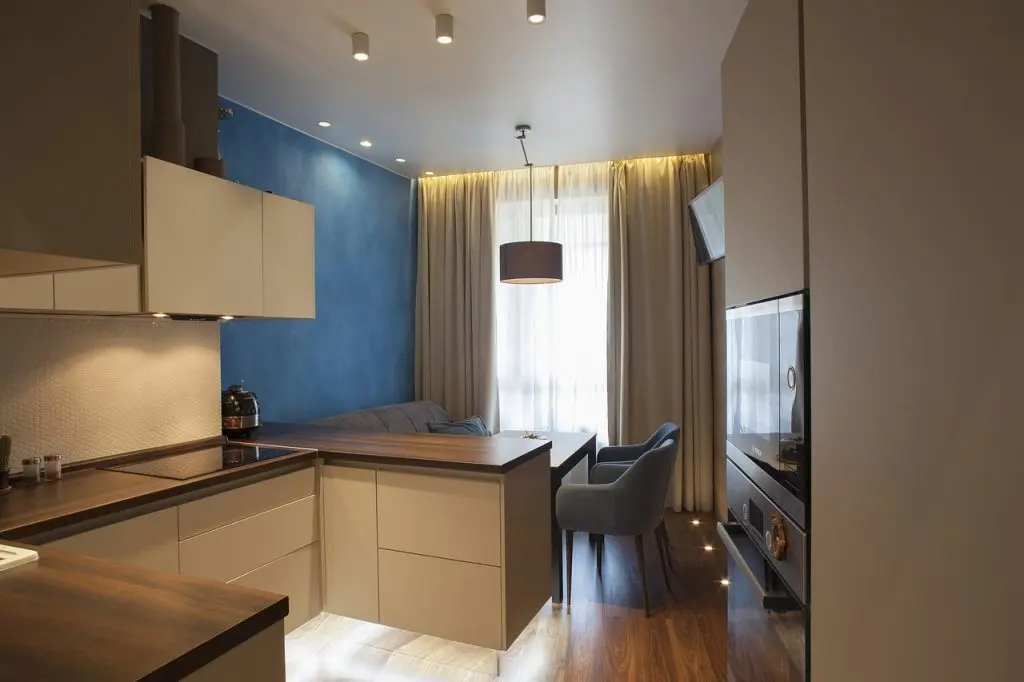 Designerul a gandit astfel o camera multifunctionala. Astfel vom gasi bucatarie, loc de luat masa si un living mic, cu o canapea si zona T V. Desi ar putea parea ingramadit, fiecare functiune in parte este bine pusa in valoare si cumva, delimitata vizual prin pozitionarea mobilierului. Dintre toate, bucataria este cel mai bine valorificata.