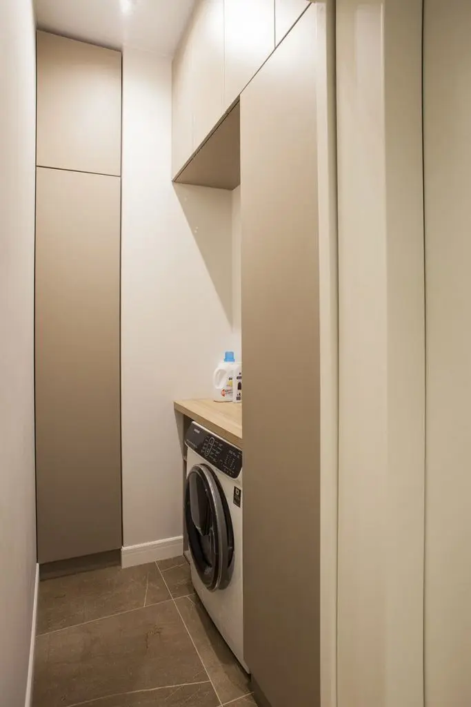Dispunerea pe doua laturi ale incaperii a fost cheia rezolvarii amenajarii zonei de zi. De o parte avem zona de gatit si cea de spalat, iar de cealalta parte, restul electrocasnicelor, toate incorporate. Dulapurile superioare dispuse pe cele doua laturi ale bucatariei, asigura zone de depozitare eficiente. In aceeasi masura au fost abordate si de cealalta parte.