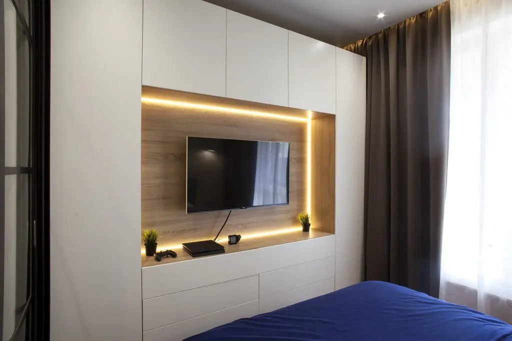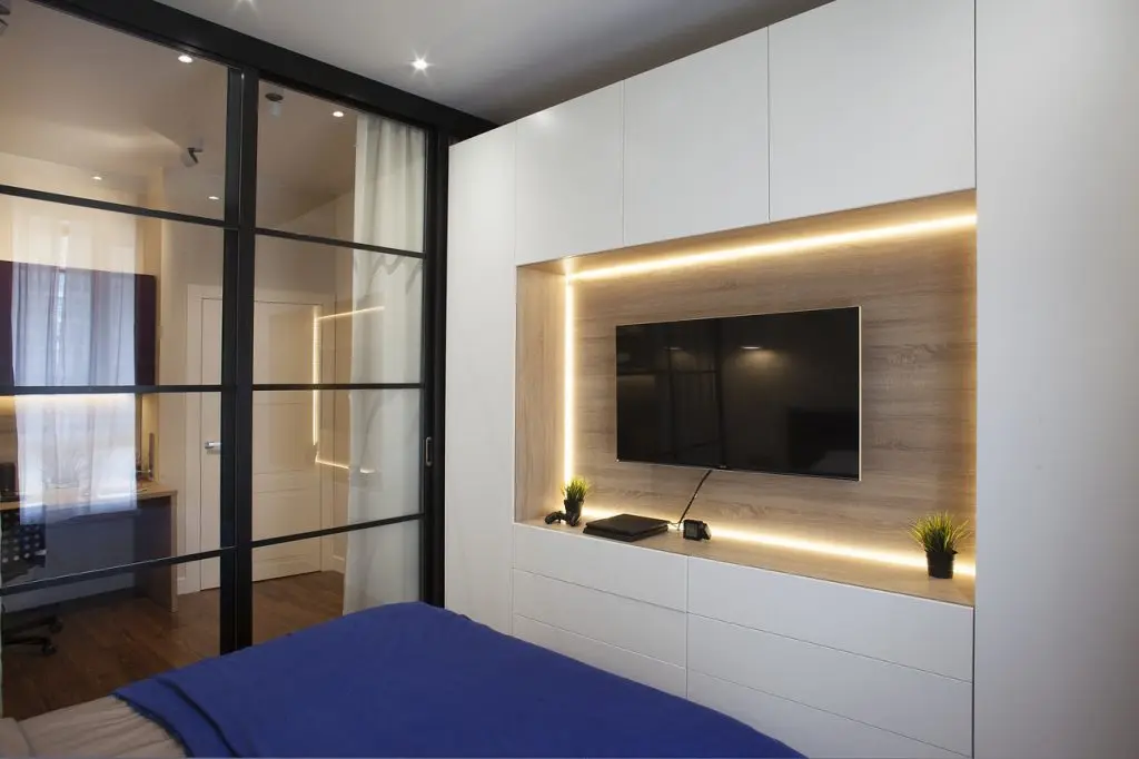 In zona de noapte, spatiul este tratat minimal si impartit in doua functiuni: avem de o parte un spatiu de lucru cu birou si, delimitat de o partitie tip glasvand, dormitorul. Zona de depozitare este uniform distribuita pe peretele cu T V-ul peretele oferind spatii necesare pentru haine.