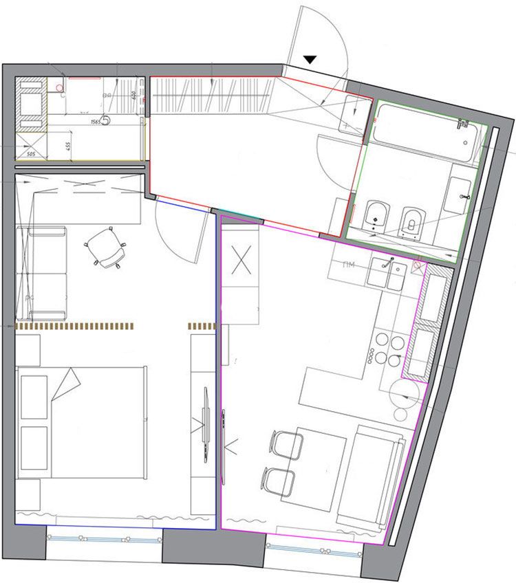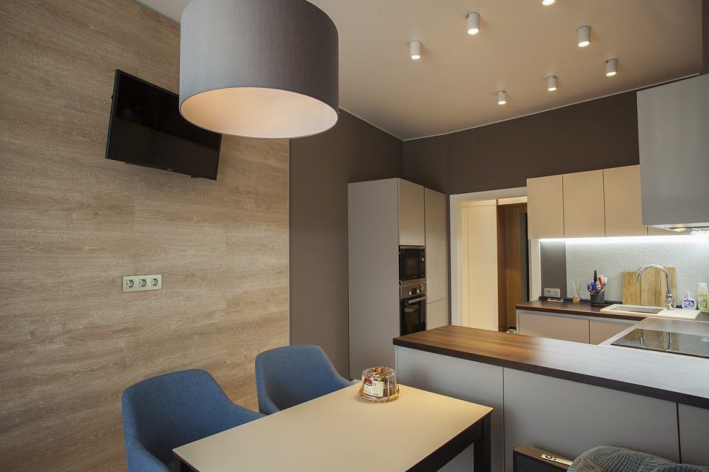 Designerul a gandit astfel o camera multifunctionala. Astfel vom gasi bucatarie, loc de luat masa si un living mic, cu o canapea si zona T V. Desi ar putea parea ingramadit, fiecare functiune in parte este bine pusa in valoare si cumva, delimitata vizual prin pozitionarea mobilierului. Dintre toate, bucataria este cel mai bine valorificata.