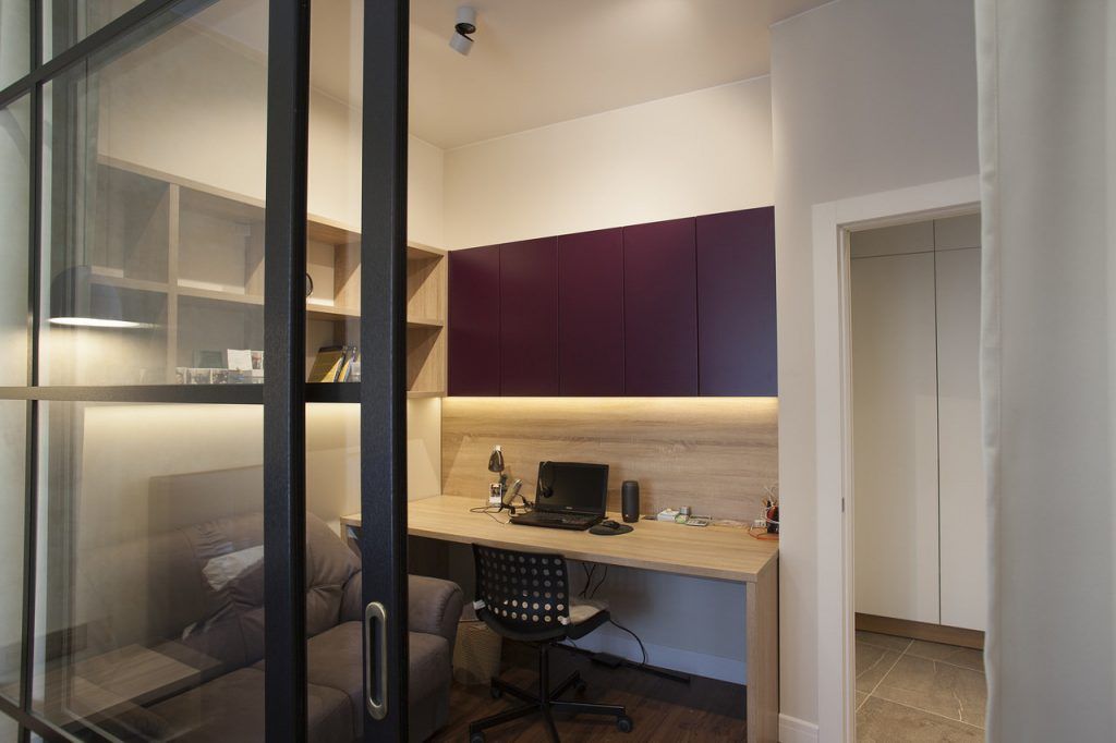 In zona de noapte, spatiul este tratat minimal si impartit in doua functiuni: avem de o parte un spatiu de lucru cu birou si, delimitat de o partitie tip glasvand, dormitorul. Zona de depozitare este uniform distribuita pe peretele cu T V-ul peretele oferind spatii necesare pentru haine.