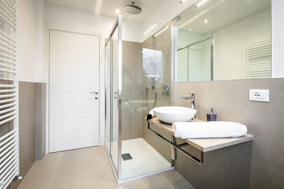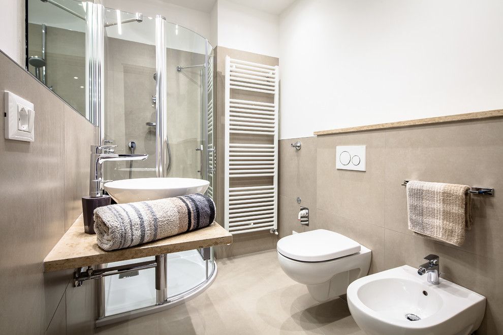 Baia pastreaza acelasi ambient prezent in restul apartamentului. Nuante de bej se imbina cu albul obiectelor sanitare pentru a spori senzatia de bine si relaxare.