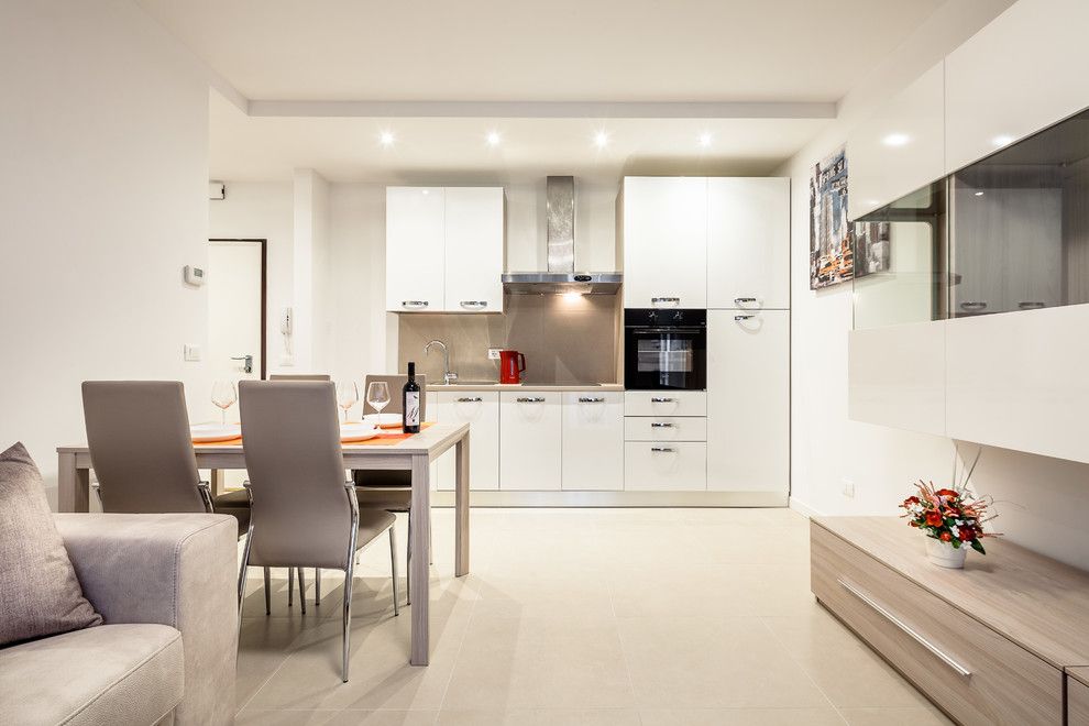 Tot in living, decorul elegant se imbina cu mobilierul simplu, in culori neutre. Insa cuierul si florile rosii sunt cele care sparg monotonia albului. Mobilierul alb si textura lemnului din care este realizat blatul sunt prezente si in bucatarie si confera un aspect luminos si aerisit amenajarii. In imediata apropiere a bucatariei regasim o zona pentru luat masa potrivita pentru patru persoane.