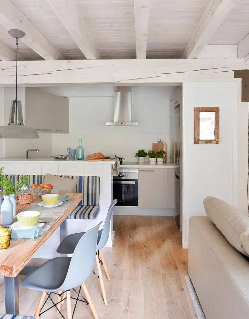 Spatiul in sine comunica direct cu bucataria, insa separarea s-a facut printr-un blat cu aspect de lambriu ce nu permite expunerea intregii zone de lucru a bucatariei.