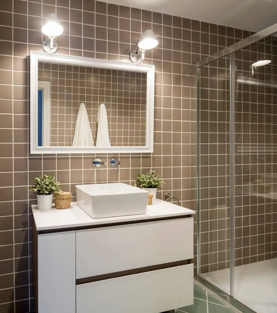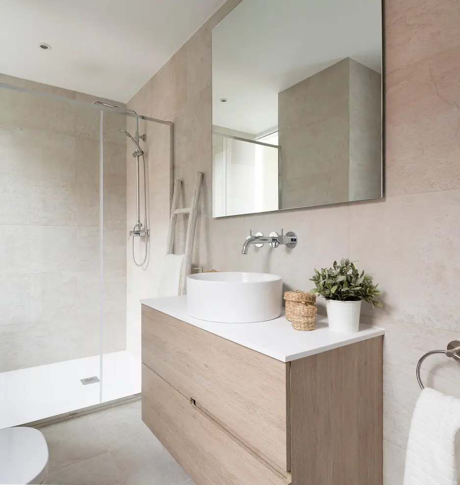 Functionalitatea este cuvantul-cheie care descrie cel mai bine baile din acest apartament. Placile ceramice ce imita piatra, intinse pe toata suprafetele bailor ofera un aspect unitar, neutru si relaxant in acelasi timp.