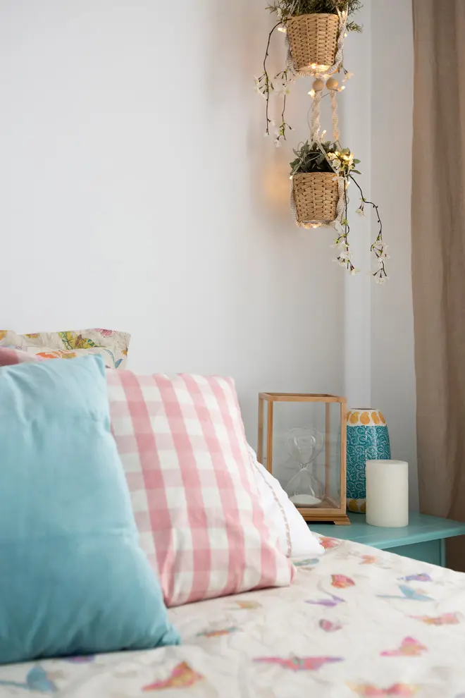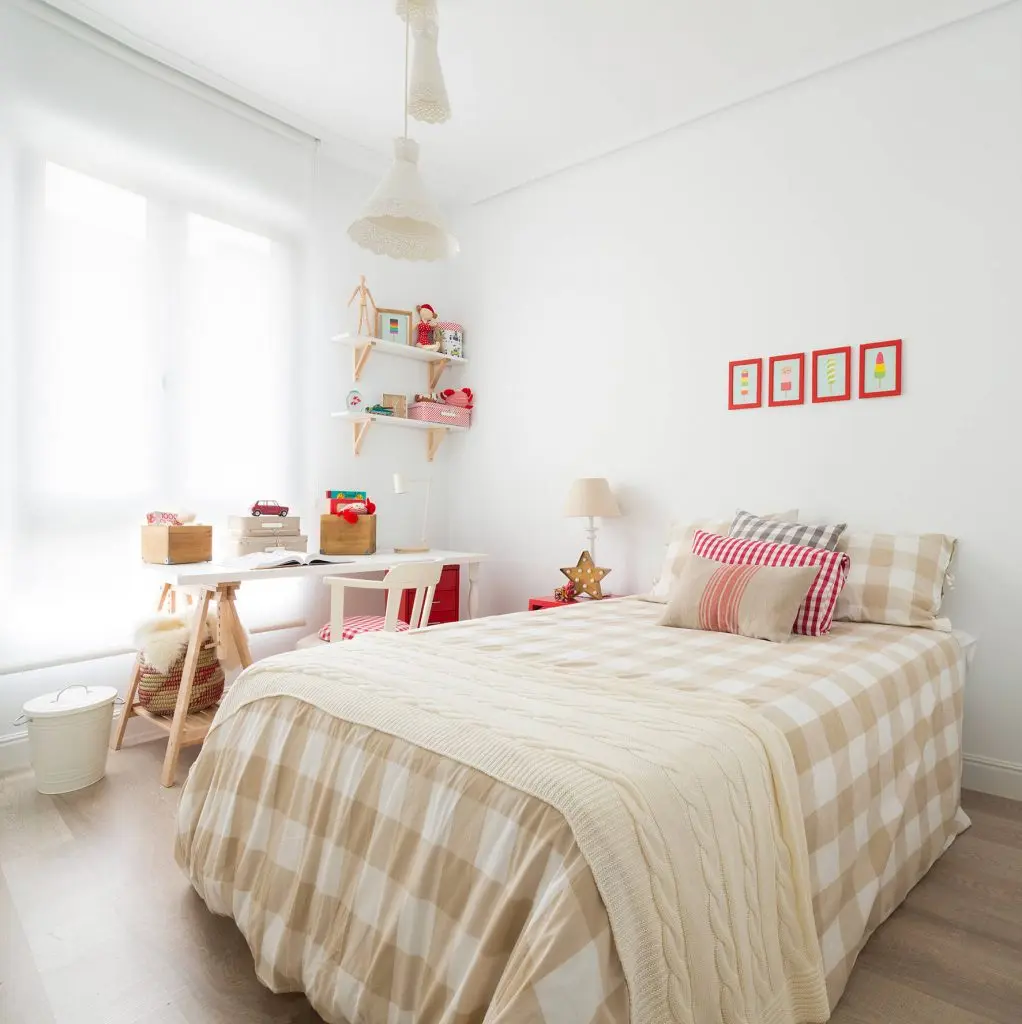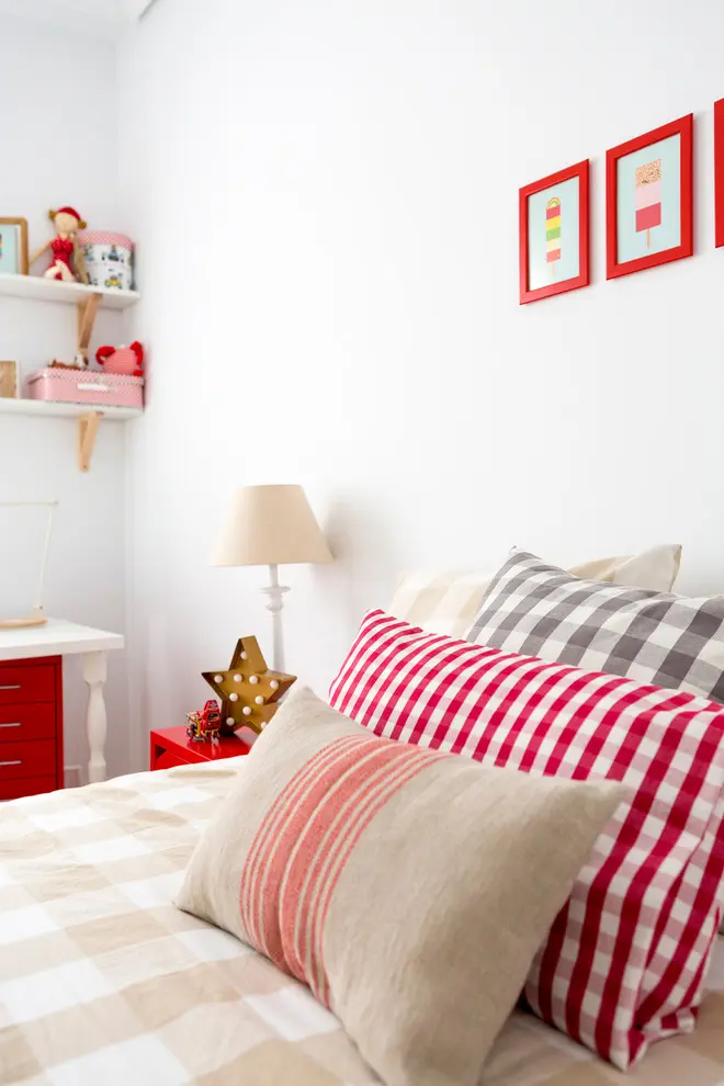 Mobilierul este redus la esential si nu incarca incaperea. Canapeaua tip coltar ofera loc de sezut pentru intreaga familie, iar apropierea de fereastra precum si lampadarul amplasat la perete ofera un excelent loc pentru lectura. Culorile accent sunt reluate sub diferite forme in amenajare, oferind astfel coerenta spatiului.