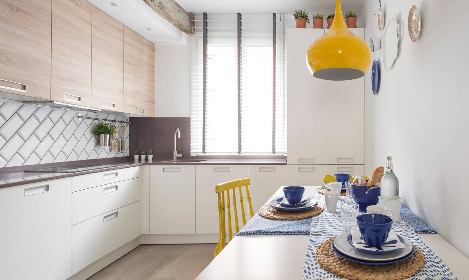 Fiind un spatiu deschis, bucataria a fost amenajata intr-un mod compact, cu mobilier dispus in forma de L si electrocasnice incorporate pentru a oferi un plus de unitate vizuala. Bucurandu-se de lumina naturala, spatiul a permis amenajarea si a unui mic dining care iese in evidenta prin accentele de galben si albastru.