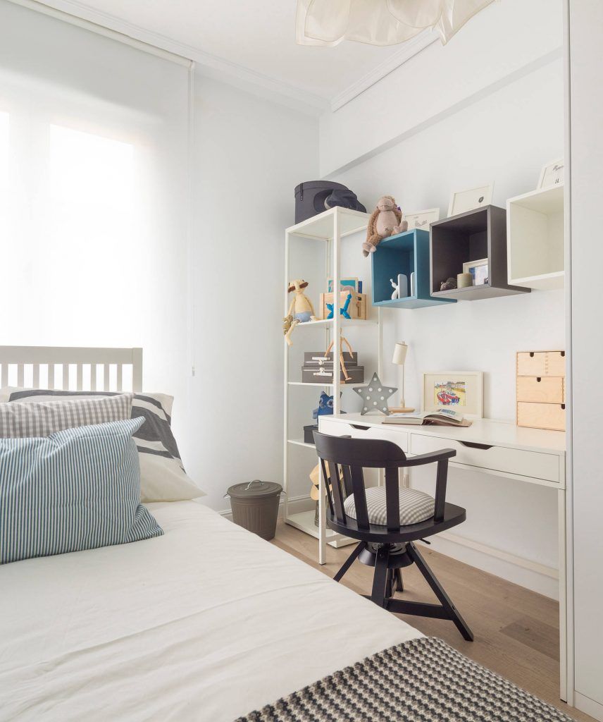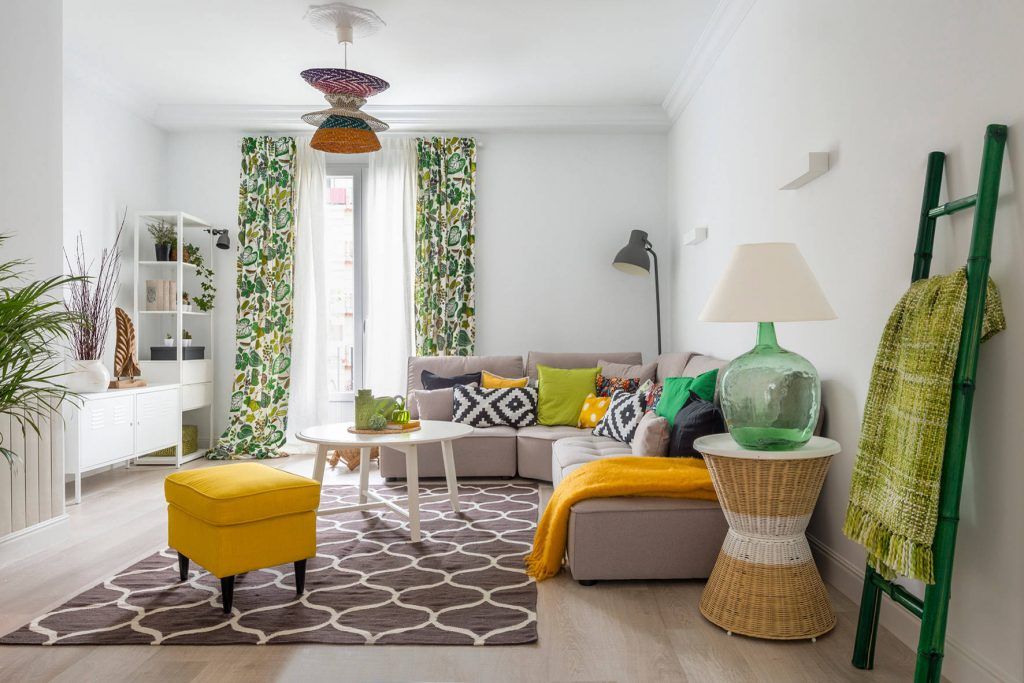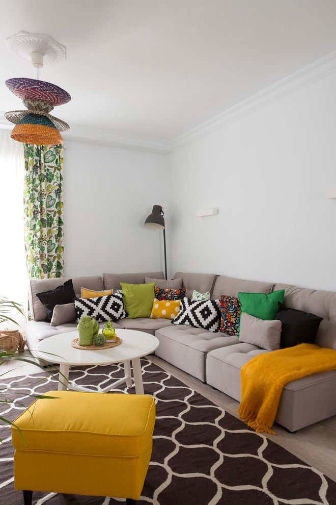 Mobilierul este redus la esential si nu incarca incaperea. Canapeaua tip coltar ofera loc de sezut pentru intreaga familie, iar apropierea de fereastra precum si lampadarul amplasat la perete ofera un excelent loc pentru lectura. Culorile accent sunt reluate sub diferite forme in amenajare, oferind astfel coerenta spatiului.