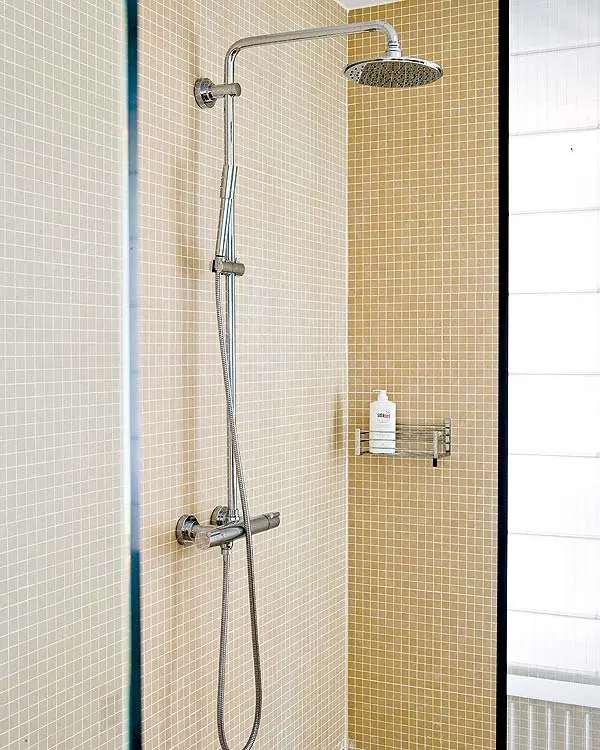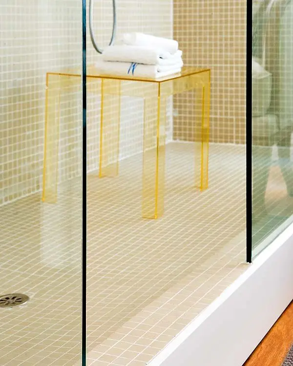 Scaunelul transparent galben continua ideea de fluiditate redata de ecranul care separa dusul de camera. Un melanj perfect intre elementele componente ale acestei amenajari inedite.