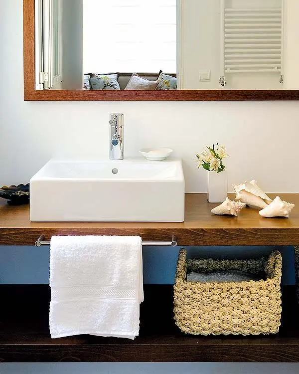 Lavoar modern cu polite din lemn, deschis pentru o depozitare sumara, dar eficienta. Oglinda mare, strategic amplasata ofera priveliste catre dormitor, practic fiind o continuare la nivel vizual atunci cand usa este deschisa.