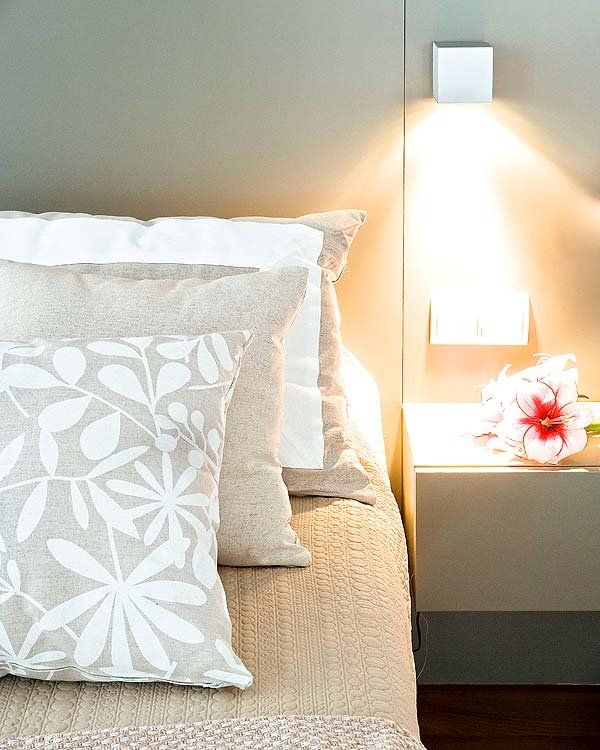 Zona de odihna: un panou gri-verde defineste spatiul patului. Masutele pe post de noptiere au un finisaj identic cu cel al panourilor. La capatul patului, banca din lemn tapitata actioneaza ca o legatura intre zone.