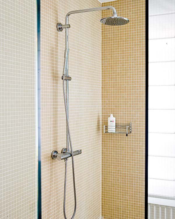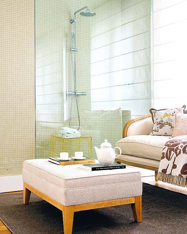 Scaunelul transparent galben continua ideea de fluiditate redata de ecranul care separa dusul de camera. Un melanj perfect intre elementele componente ale acestei amenajari inedite.