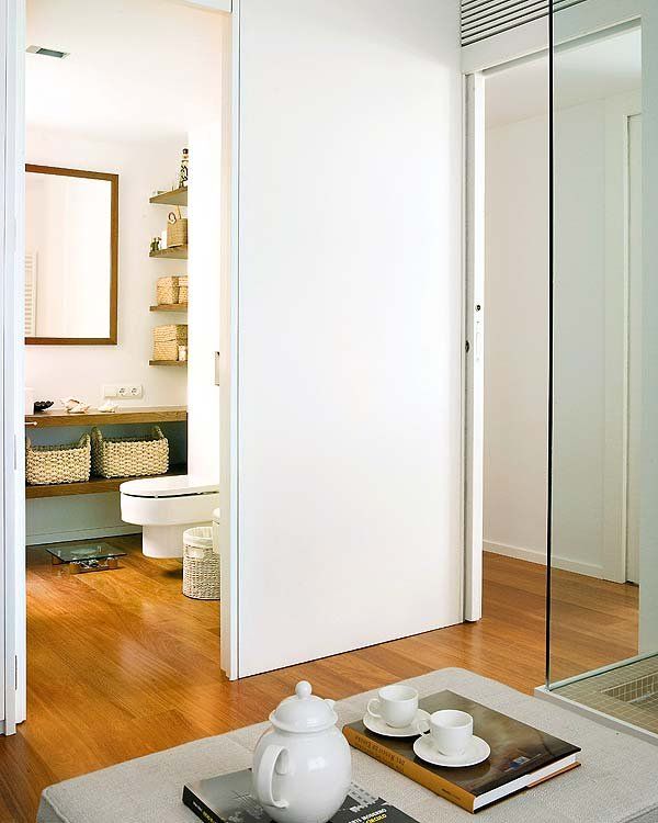 In stanga patului, in spatele unor usi culisante albe se deschide spatiul baii propriu-zise, o incapere intima cu toaleta, bideu si chiuveta precum si polite din lemn pentru depozitare.