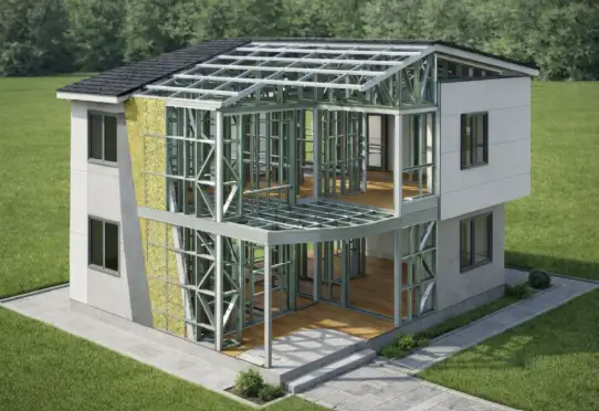 Kitul LGS livrat de Delta Concept OOD nu este doar scheletul casei. Este pachetul complet al tuturor straturilor — pereți exteriori cu toate straturile de izolație termică și fonică, barieră de vapori, OSB și finisaj exterior; pereți interiori cu izolație acustică; structura completă a acoperișului cu izolație și învelitoare.