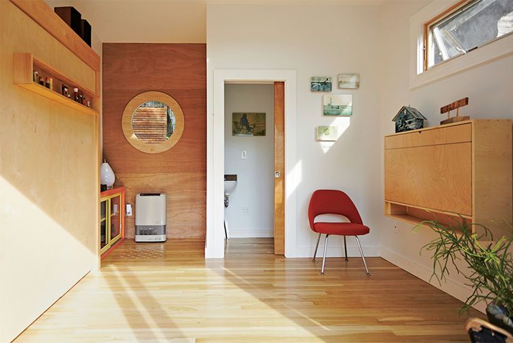 Interiorul este un spatiu luminos si confortabil care alterneaza de la functia de studio, birou, loc de joasa si spatiu de socializare, in functie de nevoile familiei. Una din provocarile amenajarii a fost construirea baii, iar pentru restul s-au folosit materiale reciclate. Majoritatea pieselor de mobila sunt rabatabile, ceea ce duce la o organizare mai buna a spatiului de locuit.