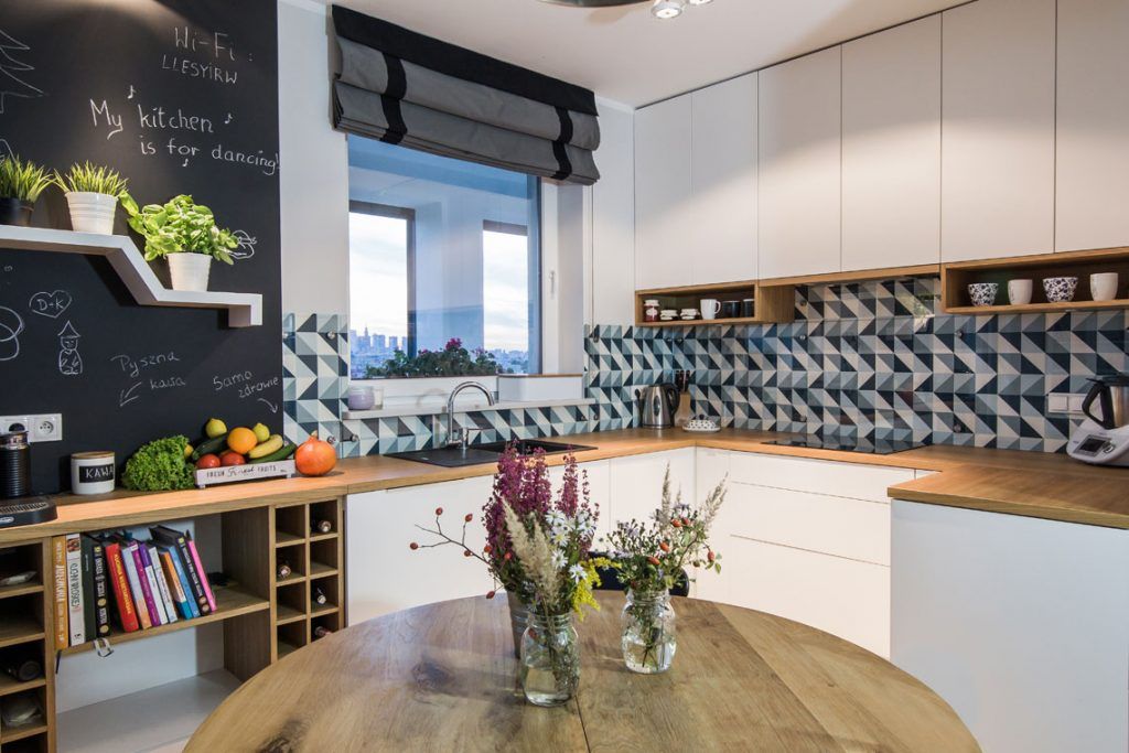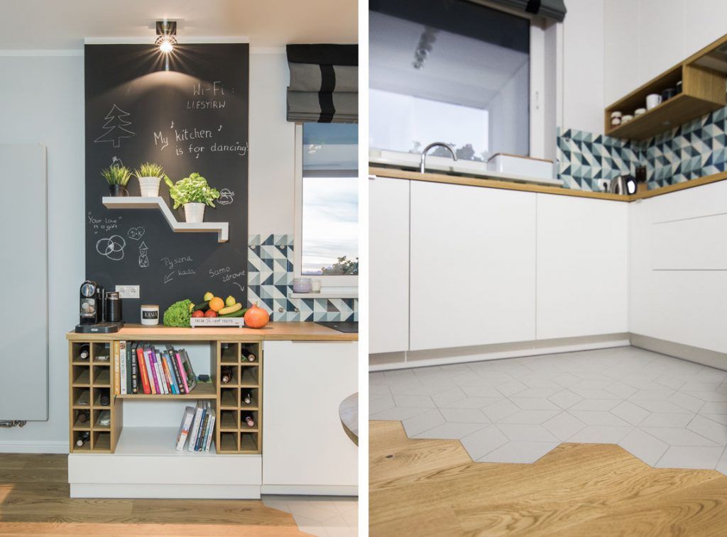 Placile decorative dintre corpurile de mobilier, dar si portiunea de perete amenajata cu vopsea de tabla scolara pe care se pot scrie mesaje cu creta reduc din caracterul tehnic al bucatariei si ii confera un plus de personalitate. Ne place mult corpul asezat in continuarea blatului bucatariei, gandit ca spatiu pentru sticle de vin si suport de carti de gatit.