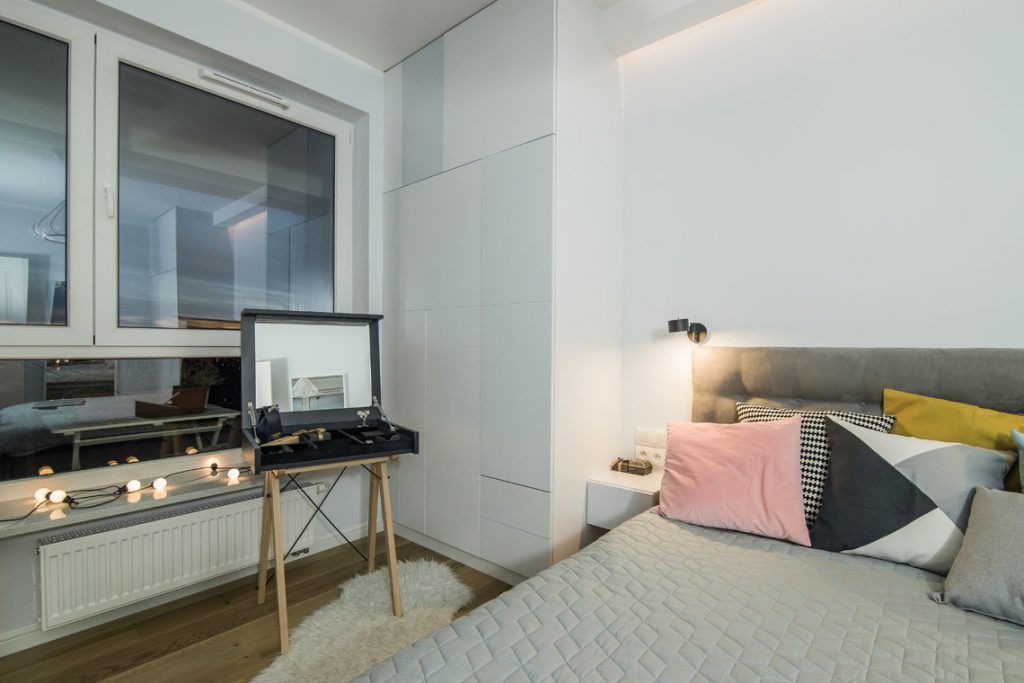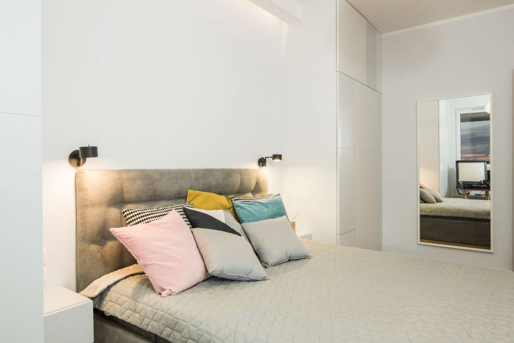 Dormitorul preia din cromatica livingului; aici designerii au mizat pe aceeasi idee a simetriei, amenajand dulapuri de o parte si de cealalta a patului. Camera pastreaza un puternic caracter functional din nevoia de a asigura spatii de depozitare pentru haine. Oglinda pozitionata pe peretele opus ferestrei reflecta lumina si imprima profunzime spatiului.