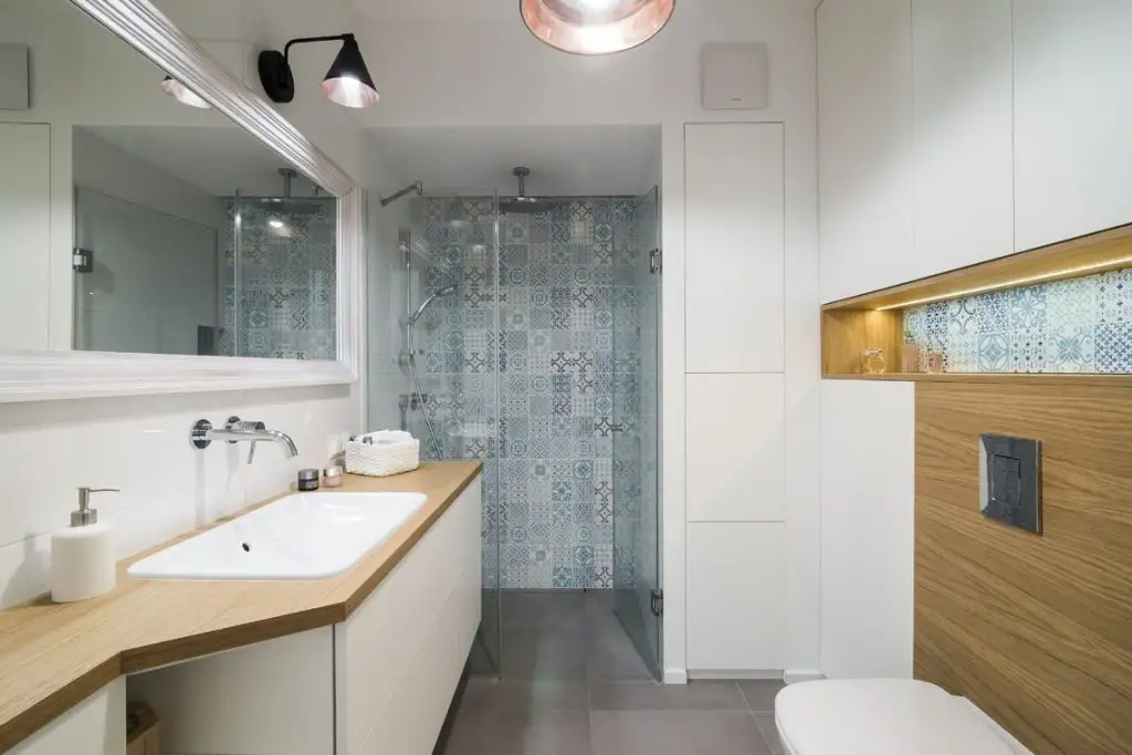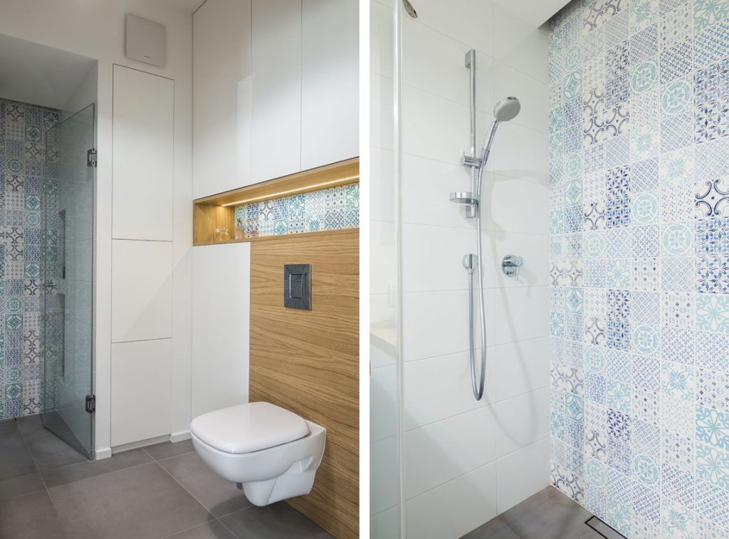In baie, oglinda de dimensiuni mari face ca spatiul sa para mai mare. Placile decorative marcheaza zone ale baii precum dusul cu scurgere directa in pardoseala sau cea a toaletei. De remarcat si aici spatiile de depozitare sub forma dulapurilor incastrate sau a sertarelor de sub lavoar.
