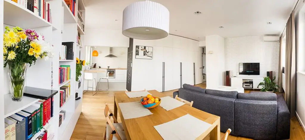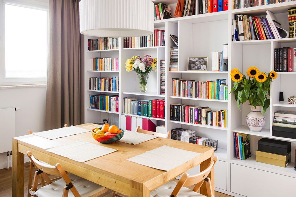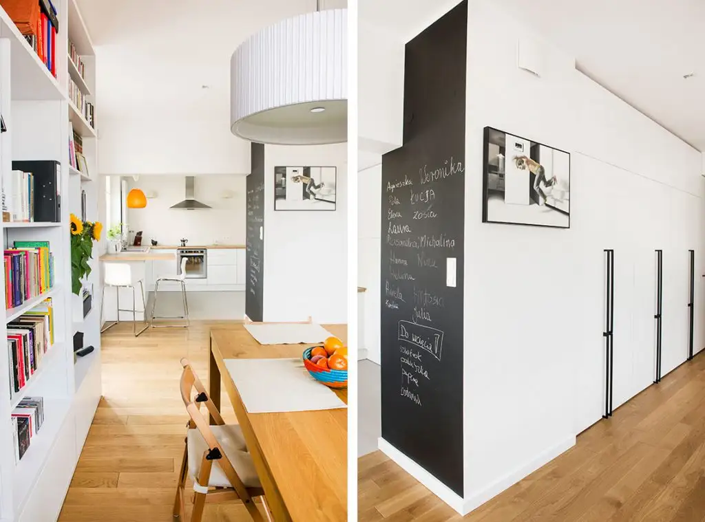 Pentru a fi cat mai aproape de bucatarie, spatiul destinat diningul se afla amenajat in dreptul acestei biblioteci, la cativa pasi de intrarea in zona de gatit. Spatiul pastreaza simplitatea ca tematica dezvoltata in intreg apartamentul.