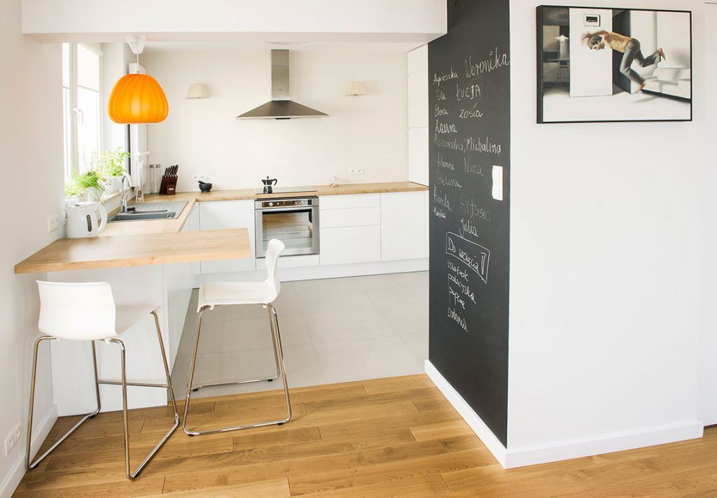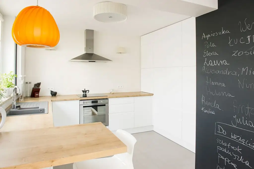 Cromatica amenajarii penduleaza intre alb dominant, cu accente de negru si pe alocuri oranj, iar esentele de stejar, prezente la nivelul pardoselii, mesei si blatului din bucatarie joaca un rol esential prin echilibrarea tonalitatii.