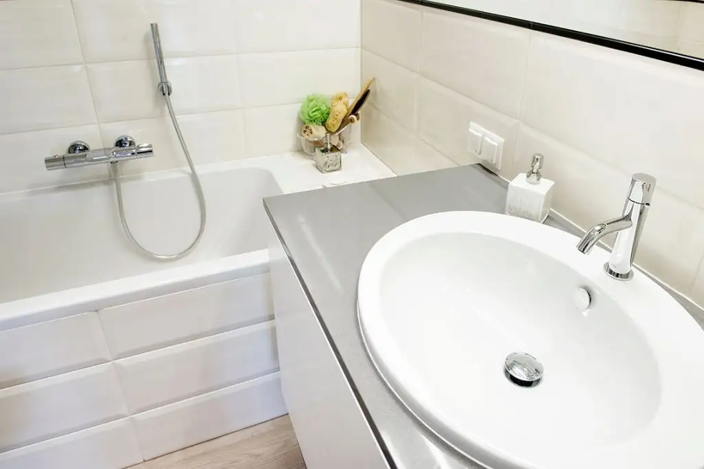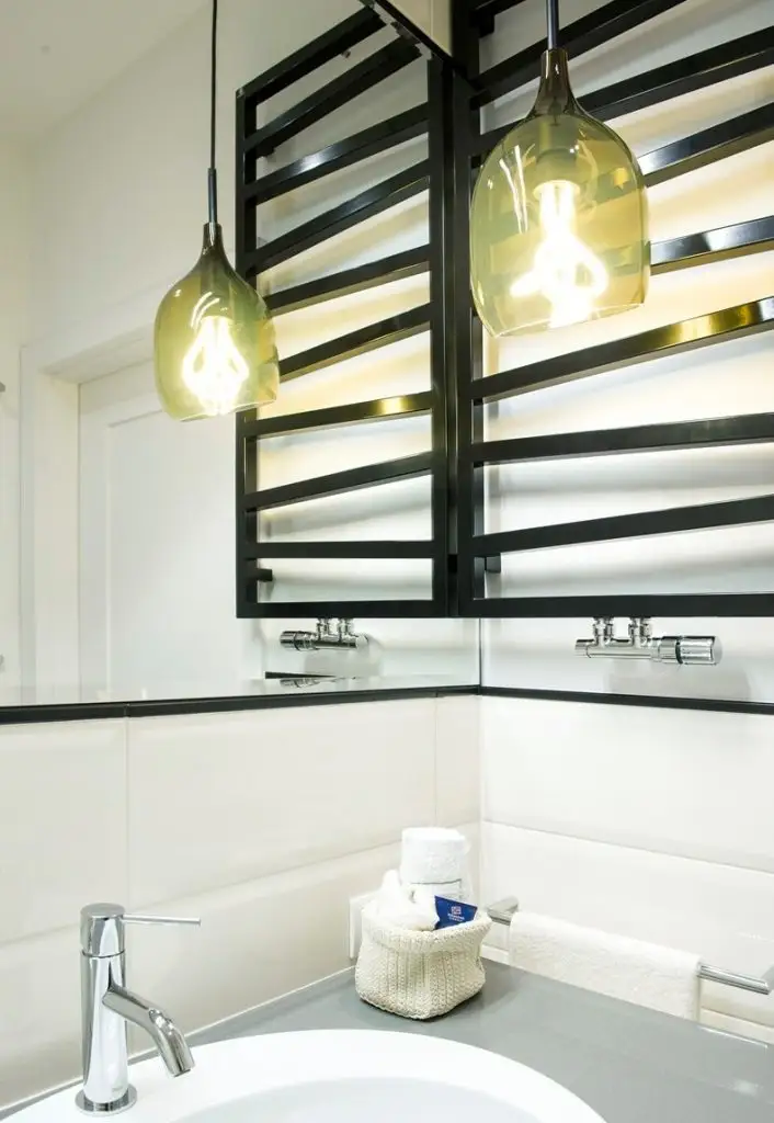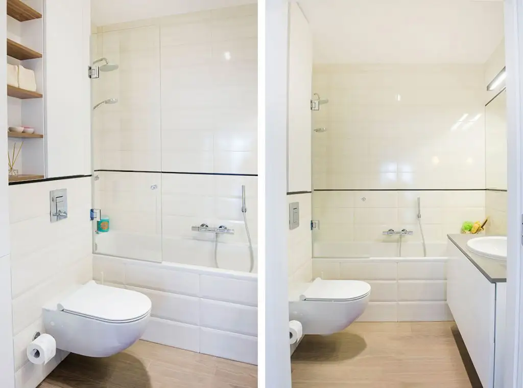 In aceeasi masura a fost amenajata si baia, cu faianta crem, gresie ce imita parchetul (reluand ideea celui real din stejar utilizat in restul casei). Dulapul conturat intr-o nisa, rafturile pentru mici decoratiuni si sertarele de sub lavoar ofera spatii pentru a depozita cele necesare baii.