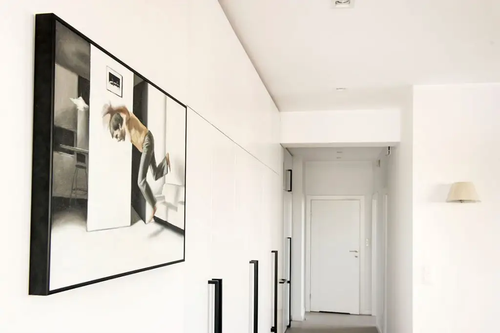 Corpul de biblioteca care ocupa aproape un intreg perete in living este poate piesa de rezistenta, care atrage privirea prin rafturile asimetrice care permit o depozitare variata; carti, cd-uri si decoratiuni de diferite marimi pot fi asezate in rafturile bibliotecii.