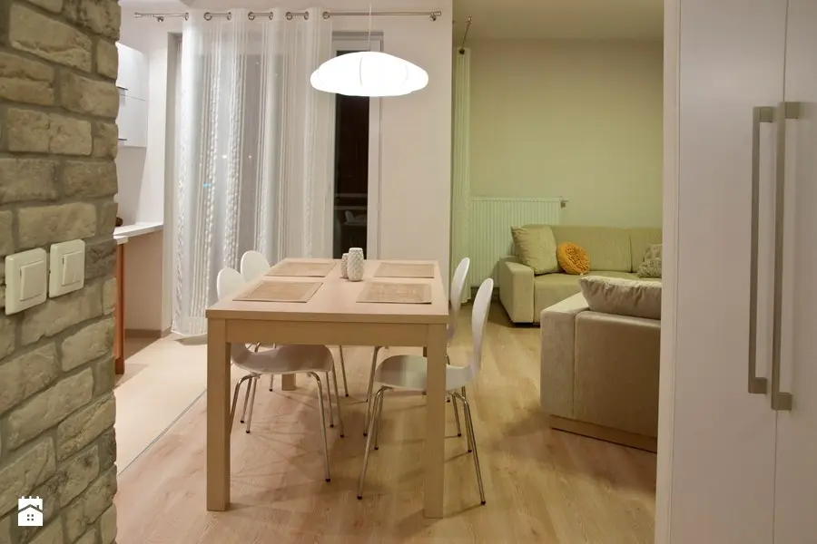 Corpul de mobilier ce cuprinde si televizorul joaca dublu rol: decorativ pe de o parte, dar si partitie, delimitand livingul de bucatarie. Acelasi rol il joaca si locul de luat masa, ce face trecerea dinspre camera spre spatiul tehnic al bucatariei. Alegerea unei mese simple cu scaune tip Eames si corp de iluminat suspendat este o solutie pragmatica ce ne aminteste de interioarele scandinave.